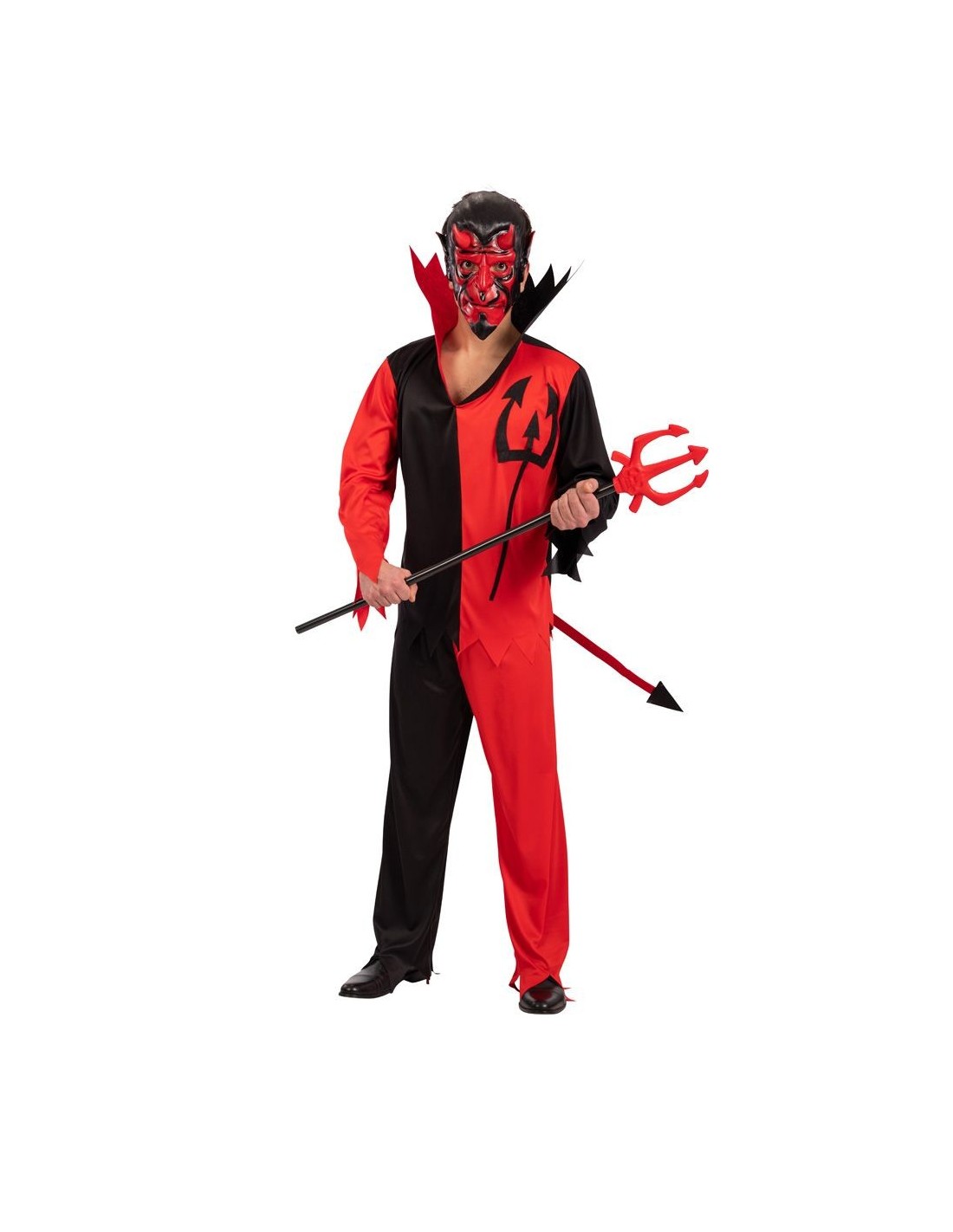 Trasformati nel signore degli inferi con questo impressionante costume da demone rosso e nero. Il set include una tuta bicolore dal design accattivante con dettagli diabolici, una maschera terrificamente realistica con corna pronunciate e un forcone teatrale per completare la trasformazione demoniaca. Il costume presenta una vestibilità comoda e materiali resistenti che garantiscono libertà di movimento durante tutta la serata. Perfetto per chi vuole incarnare il lato oscuro con stile e fare una figura davvero memorabile.