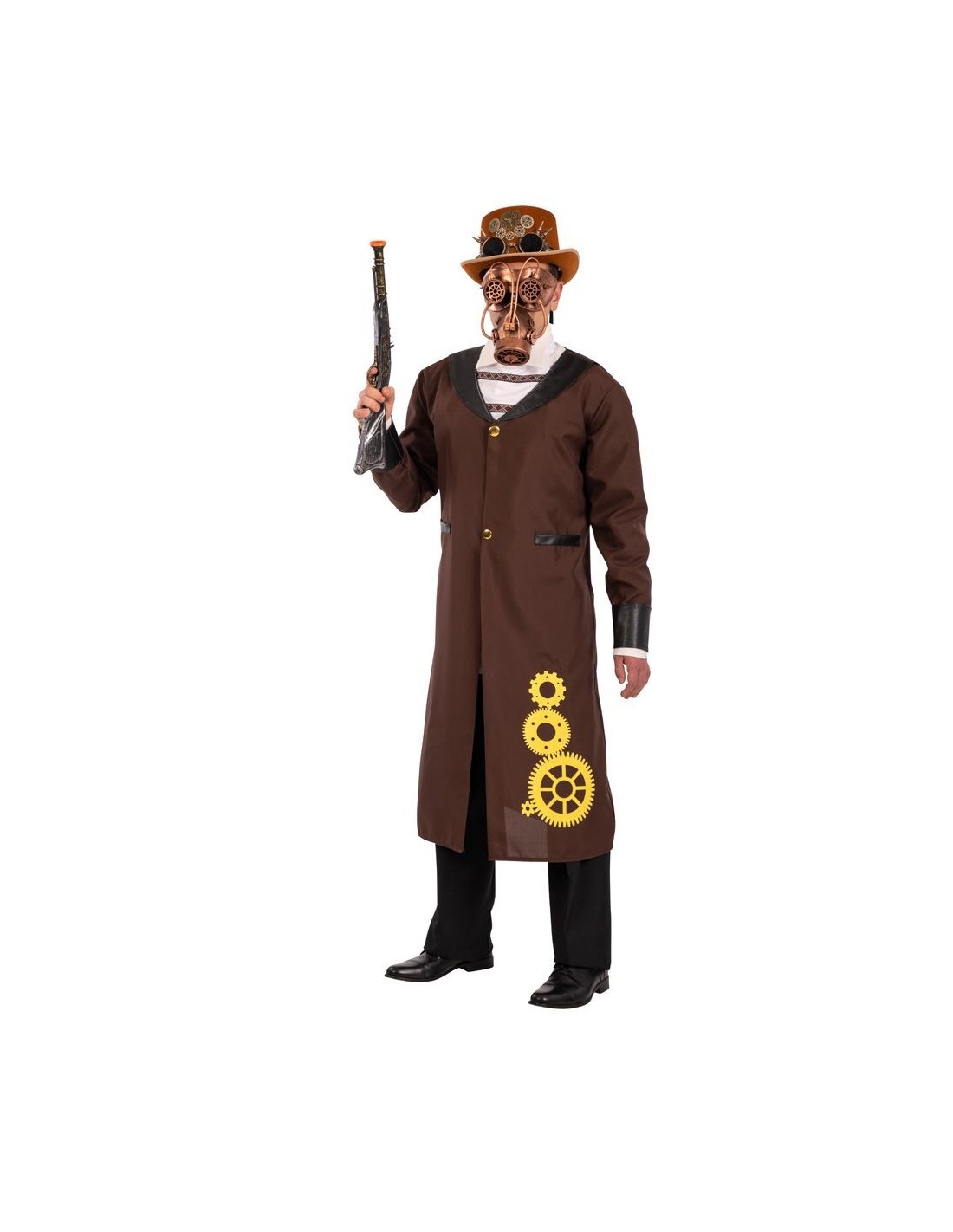 Trasformati in un affascinante gentleman dell'era steampunk con questo costume completo che include cappotto lungo marrone con decorazioni dorate a ingranaggi, camicia bianca, cravatta elegante e cappello coordinato. Il look è completato da una caratteristica maschera in bronzo che richiama l'estetica vittoriana industriale. Il cappotto presenta bottoni frontali e tasche, mentre le decorazioni dorate sui fianchi riproducono fedelmente i motivi meccanici tipici del genere steampunk.