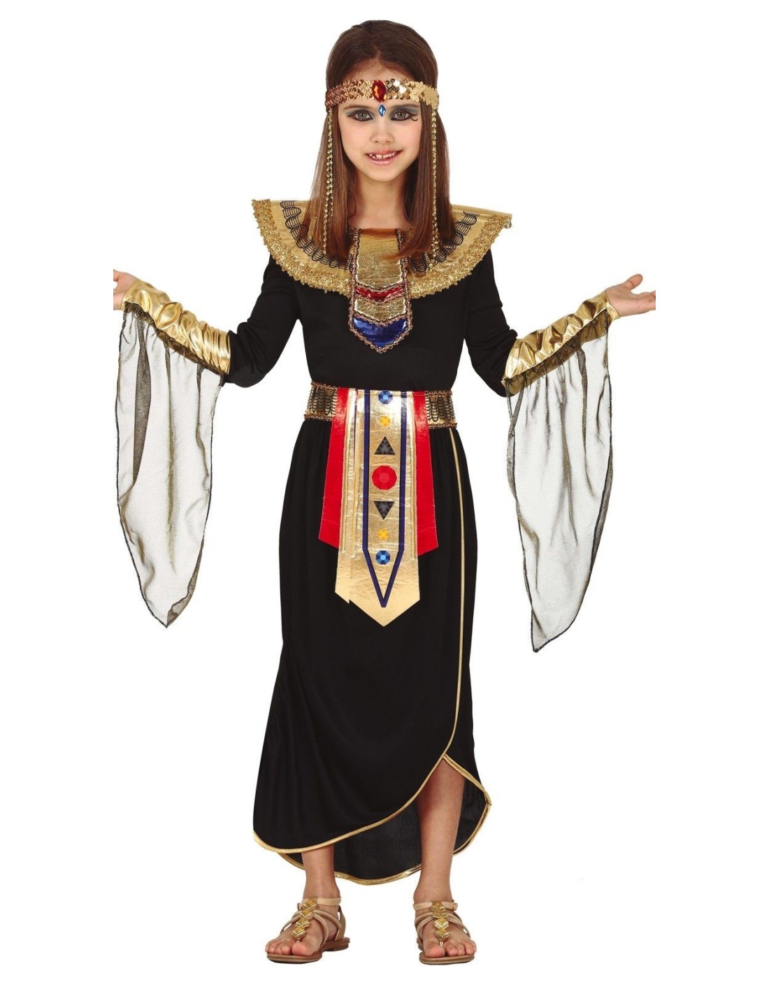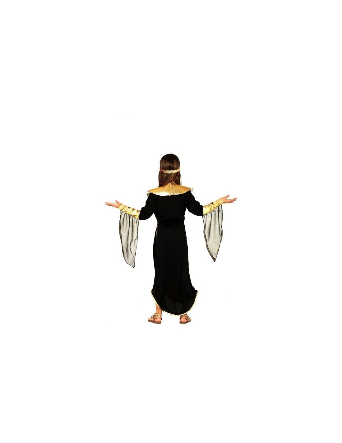Trasforma la tua bambina in una splendida principessa dell'antico Egitto con questo affascinante costume da egiziana. Il set completo comprende un elegante vestito nero con dettagli dorati, una cintura decorativa con motivi colorati e un collare dorato in perfetto stile faraonico. Il costume è realizzato per bambine dai 7 ai 9 anni e presenta elementi tipici dell'antica civiltà egizia: spalline dorate, decorazioni geometriche e la caratteristica silhouette lunga con spacco laterale. La fascia per capelli completa il look regale.