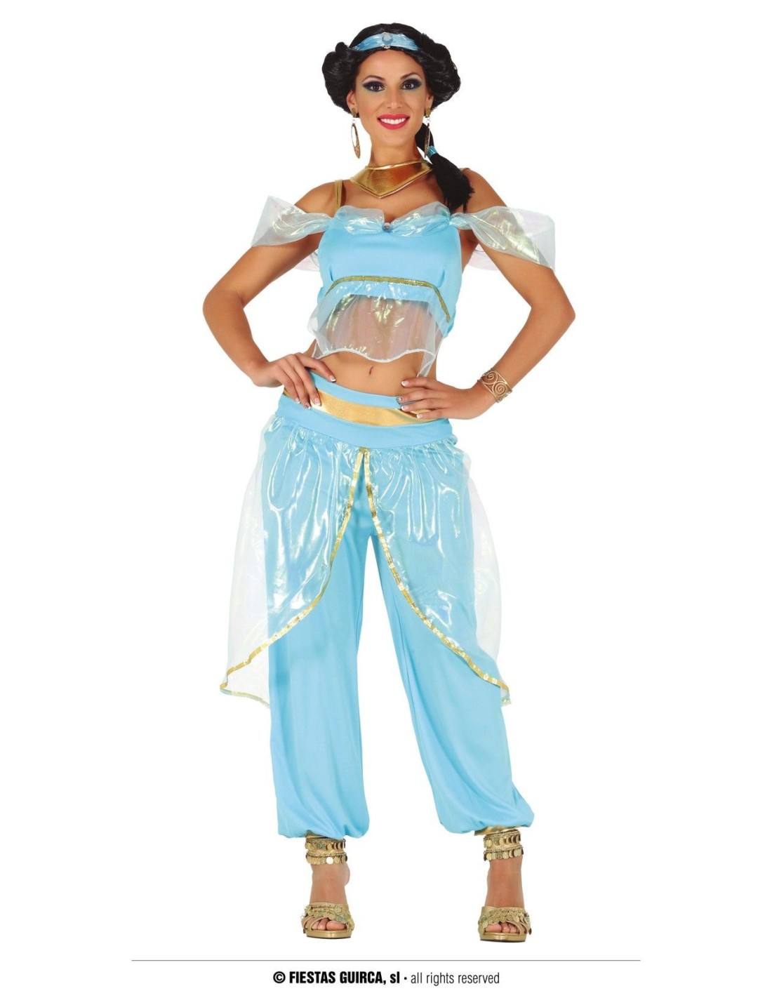 Trasformati nella bellissima principessa Jasmine con questo incantevole costume ispirato al celebre personaggio Disney di Aladdin. Il set completo include un elegante top azzurro decorato con dettagli dorati, pantaloni palazzo coordinati in tessuto fluido e vaporoso che ricrea perfettamente il look orientale della principessa. Il costume è realizzato in materiali leggeri e confortevoli che garantiscono libertà di movimento durante tutta la festa.