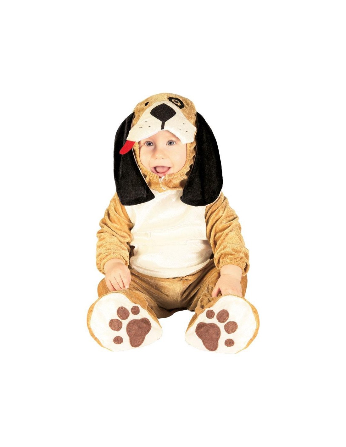 Adorabile costume da cagnolino realizzato in morbida peluche, pensato appositamente per bambini dai 12 ai 18 mesi. La tutina avvolge delicatamente il piccolo con un design che riproduce fedelmente le sembianze di un tenero cucciolo, caratterizzata da colori caldi beige e marrone con dettagli bianchi sul petto. Il cappuccio presenta lunghe orecchie pendenti nere, musetto ricamato e piccola lingua rosa che sporge. La tutina include anche i piedini con stampe di zampette, completando perfettamente l'effetto travestimento. Chiusura pratica per facilitare il cambio del pannolino durante le feste.