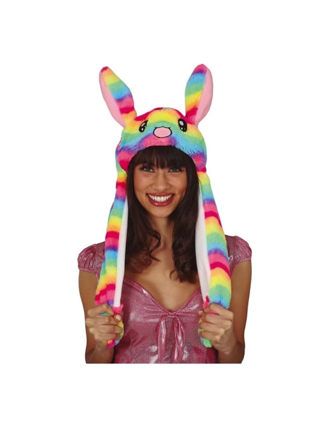 Questo divertentissimo cappello da coniglietta presenta vivaci colori arcobaleno che creano un effetto allegro e giocoso. Il design include lunghe orecchie pendenti che si muovono ad ogni movimento della testa, rendendo il travestimento ancora più dinamico e coinvolgente. Il cappello è realizzato in morbido tessuto felpato con fantasie multicolore che spaziano dal rosa al blu, dal giallo al verde. Dotato di comodi lacci laterali per essere indossato facilmente, questo accessorio trasforma immediatamente chiunque in una simpatica coniglietta colorata.
