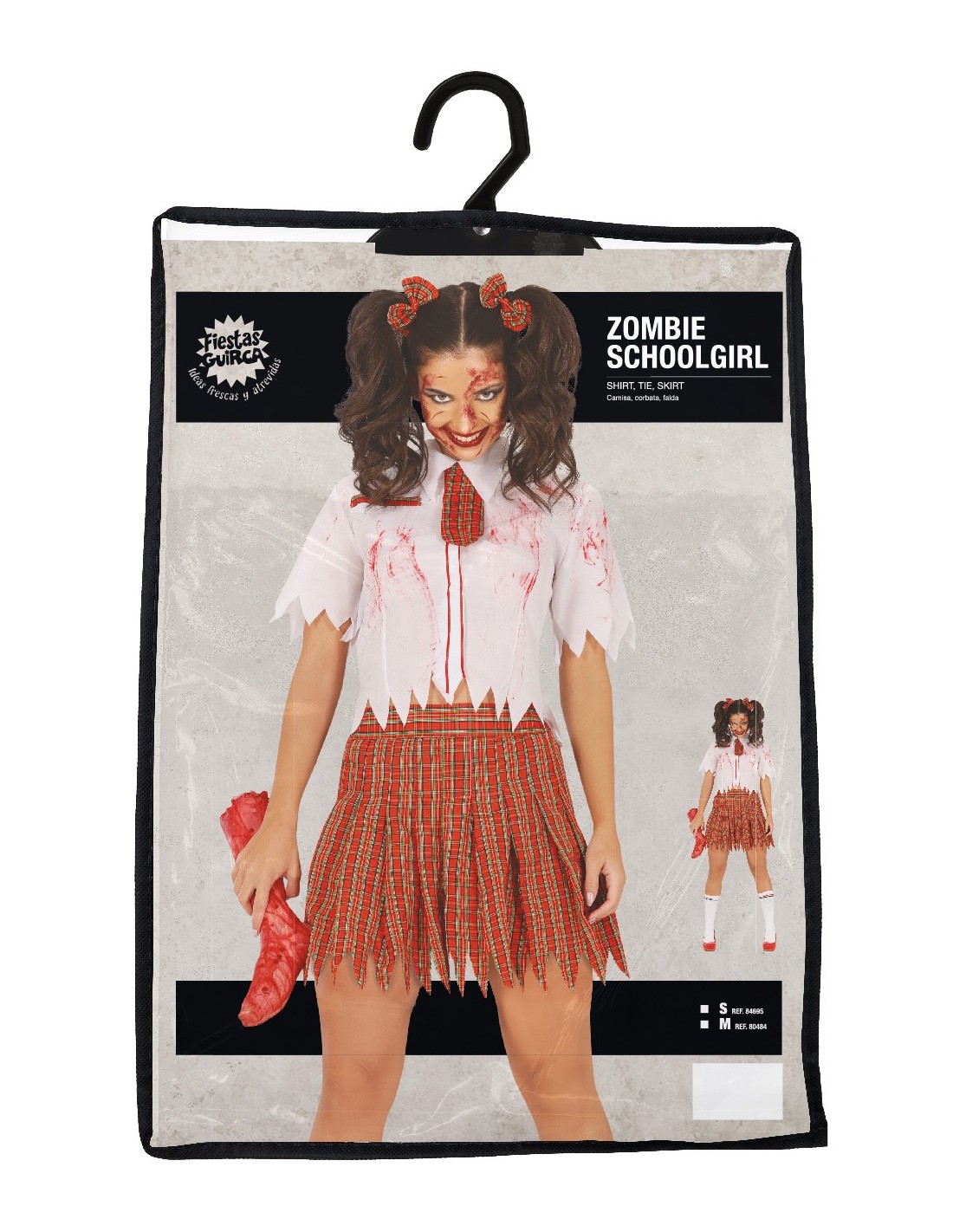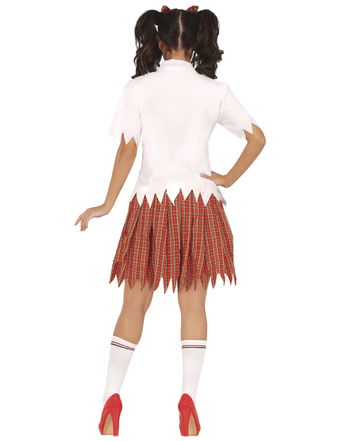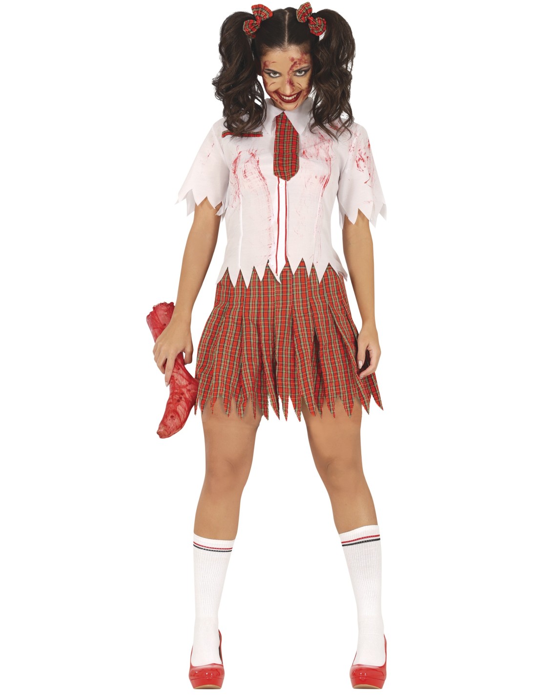 Trasformati in una terrificante studentessa zombie con questo agghiacciante costume perfetto per Halloween. Il set include una camicia bianca macchiata di sangue con cravatta rossa a quadri e una gonna plissettata rossa coordinata, entrambi decorati con dettagli strappati e invecchiati per un effetto realistico. L'outfit è completato da calze bianche sporche che amplificano l'aspetto da non-morto. I tessuti sono trattati per simulare l'usura e le macchie tipiche di un look da sopravvissuta zombie, creando un insieme davvero spaventoso.