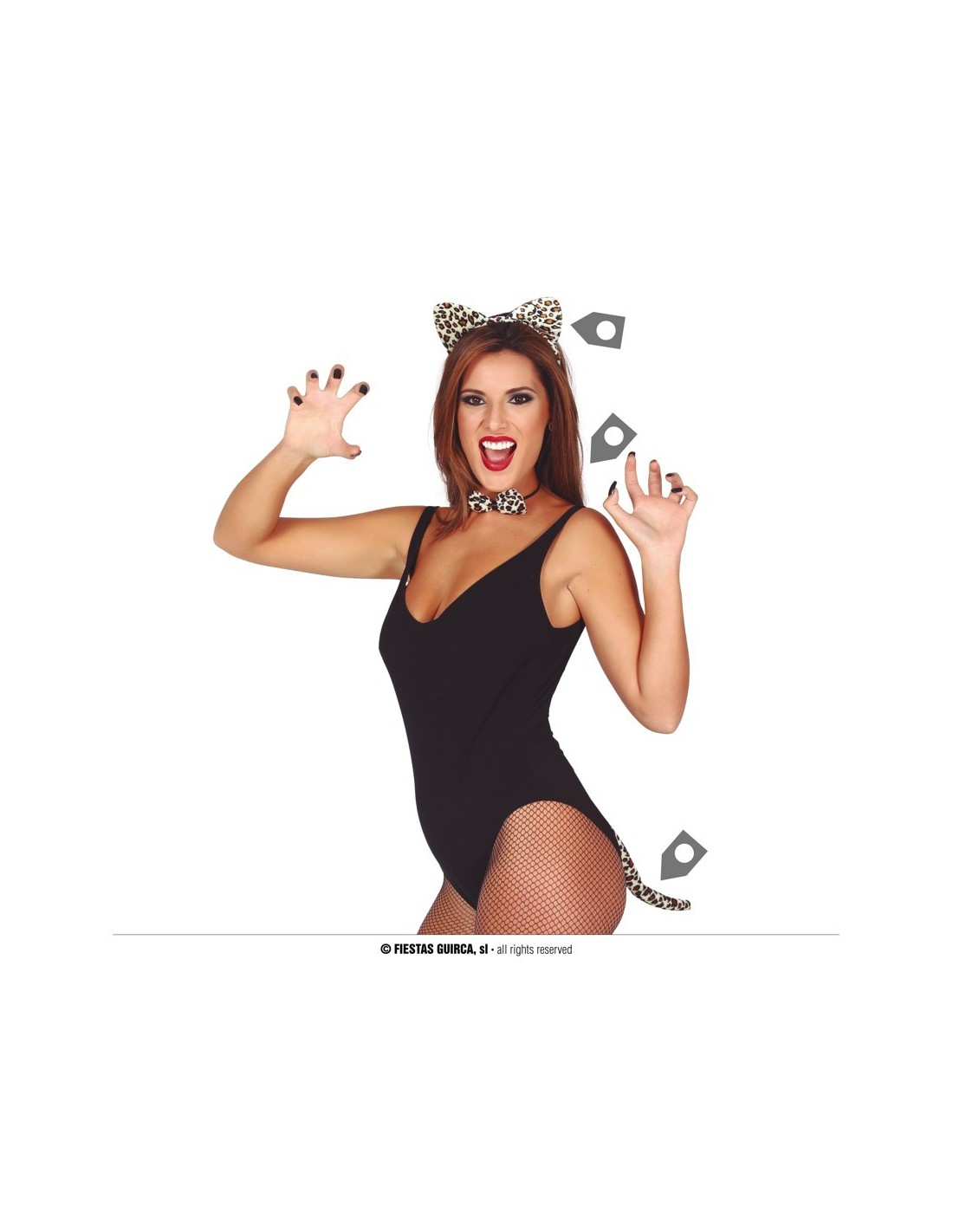 Trasformati nella regina della giungla con questo affascinante set costume da leopardo che include tutto il necessario per un look felino perfetto. Il set comprende un elegante body nero aderente con scollatura a V, orecchie leopardate con fascia per capelli, collare coordinato e coda con stampa maculata. Il tessuto stretch garantisce una vestibilità comoda e femminile, mentre gli accessori leopardati completano il travestimento con stile selvaggio.