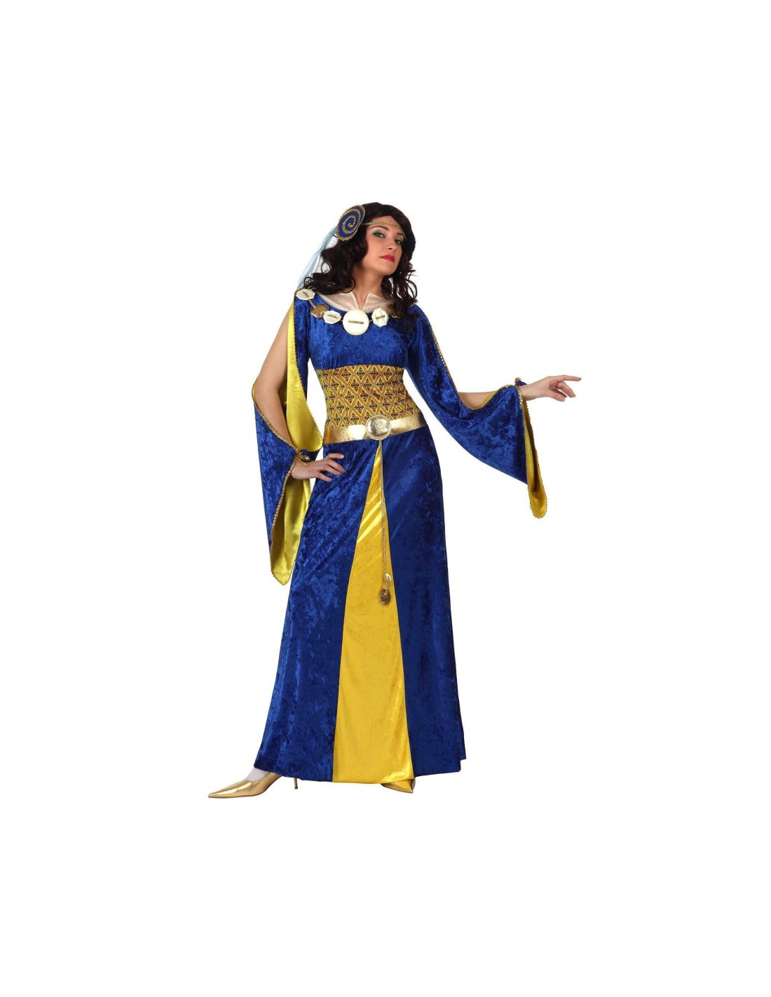 Trasformati in una maestosa sovrana del Medioevo con questo splendido costume da Regina Medievale. Il set è caratterizzato da un elegante abito lungo in tessuto blu reale impreziosito da dettagli dorati, con maniche ampie e svasate che donano regalità e nobiltà al look. L'abito presenta pannelli gialli sui lati che creano un bellissimo contrasto cromatico e una fascia dorata decorativa in vita che valorizza la silhouette. Il costume è realizzato con materiali di qualità che garantiscono comfort e resistenza, perfetto per farvi sentire delle vere regine medievali.