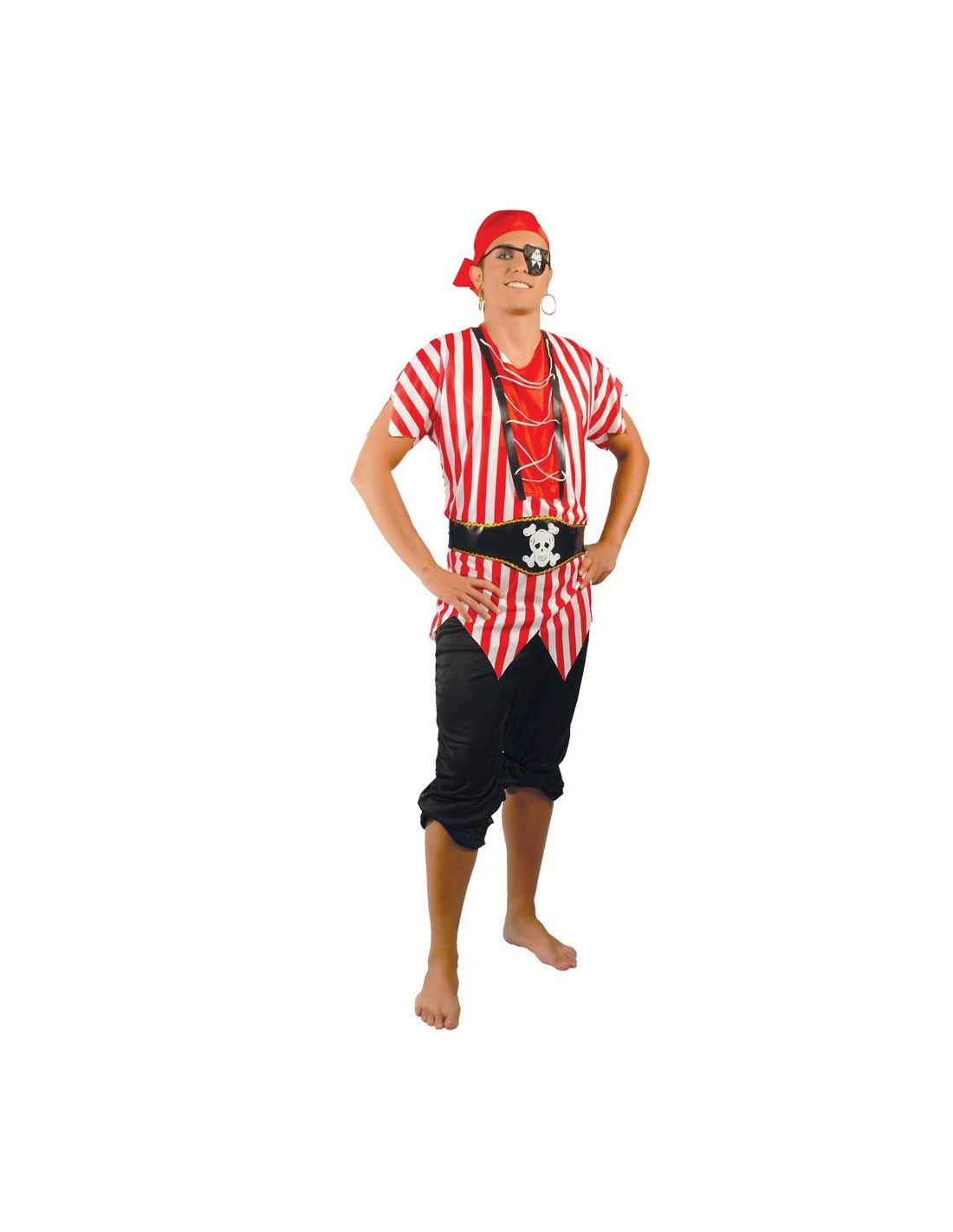 Trasformati nel più temuto corsaro dei sette mari con questo autentico costume da pirata dei mari! Il set completo comprende una caratteristica camicia a righe rosse e bianche con scollo profondo, pantaloni neri al ginocchio in stile corsaro, cintura nera con fibbia decorativa e bandana rossa per la testa. L'outfit è completato da una collana con ciondolo teschio che aggiunge il tocco finale al look da vero bucaniere. Il costume presenta dettagli accurati che richiamano l'epoca d'oro della pirateria.