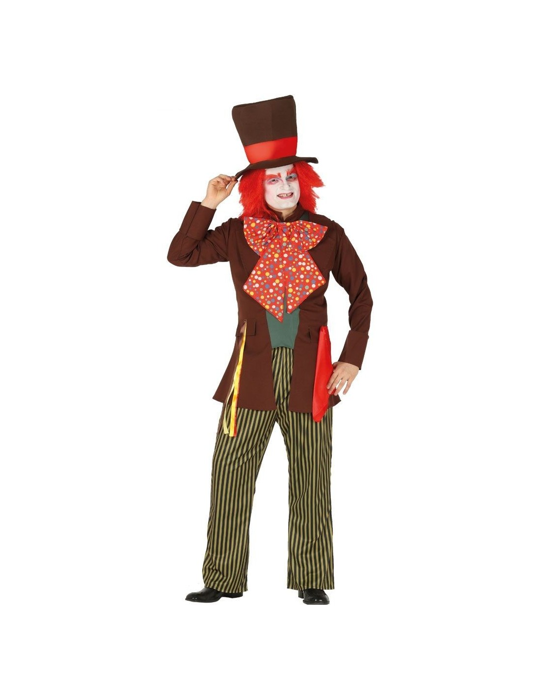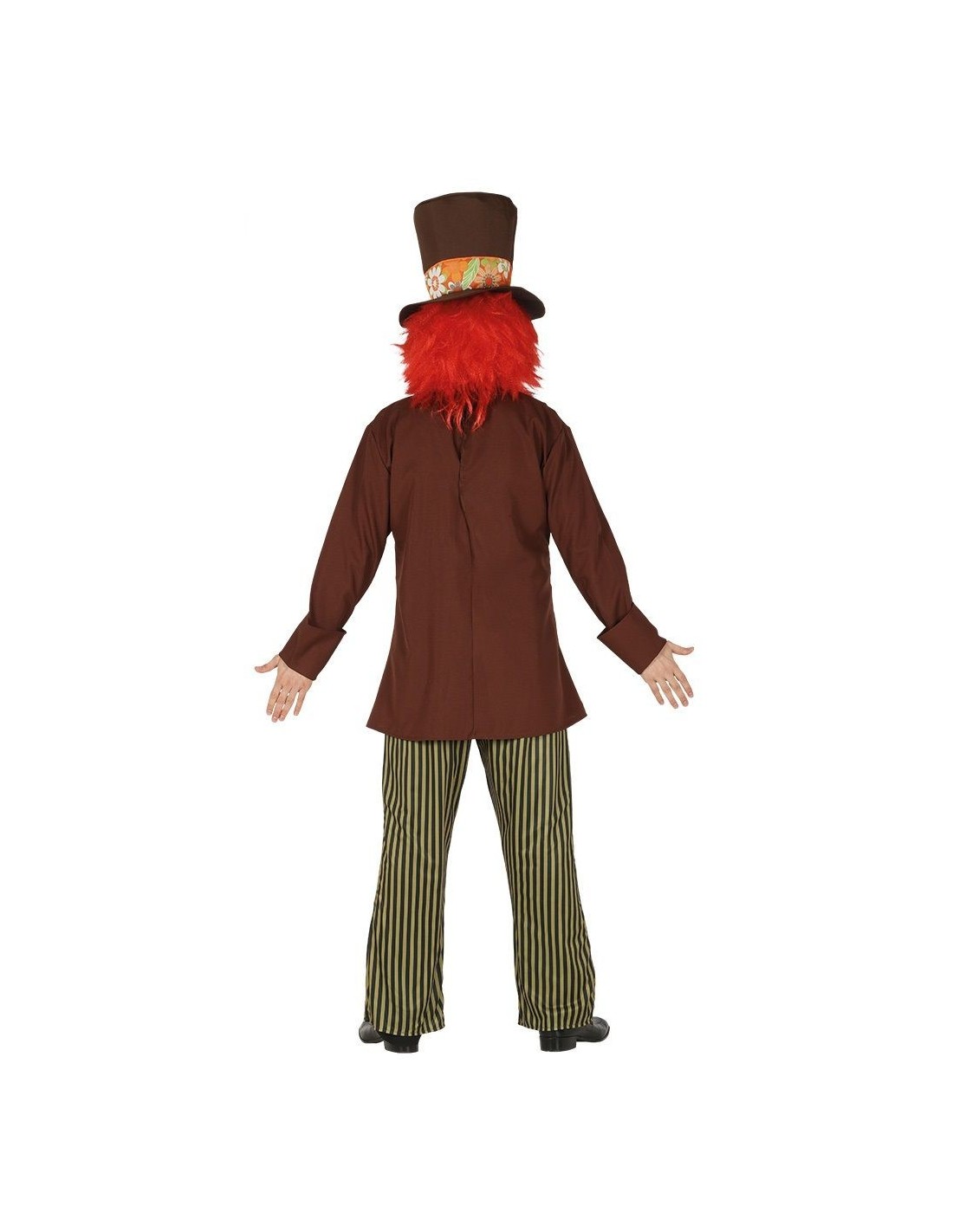 Trasformati nel leggendario Cappellaio Matto con questo costume ispirato al personaggio di Alice nel Paese delle Meraviglie. Il set comprende una giacca marrone con dettagli decorativi colorati, pantaloni a righe verdi e gialle, una sciarpa verde e l'iconico cappello a cilindro marrone con fascia rossa. I dettagli accurati includono motivi floreali sul gilet e bottoni decorativi che richiamano perfettamente l'estetica del famoso personaggio letterario.