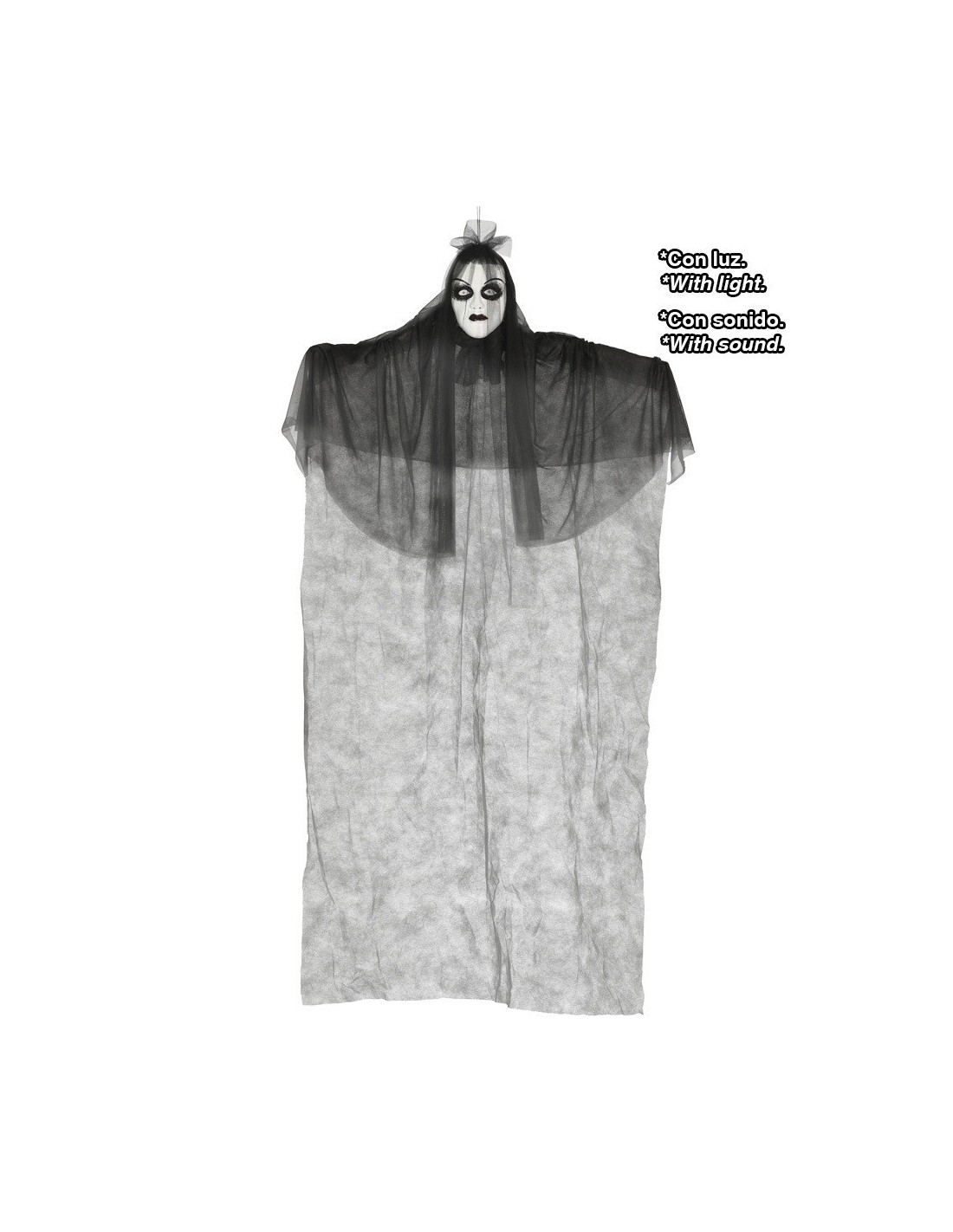 Crea un'atmosfera da brivido con questa vampiressa da appendere, perfetta per decorare la tua casa o il tuo locale durante Halloween. La figura spettrale presenta effetti speciali che si attivano con il movimento: gli occhi si illuminano di una luce sinistra mentre emette suoni inquietanti che faranno sobbalzare i tuoi ospiti. Il lungo drappo grigio che avvolge la figura crea un effetto teatrale molto suggestivo, mentre il volto cadaverico e i capelli scompigliati completano il look terrificante. Si appende facilmente ovunque grazie al sistema di fissaggio integrato.