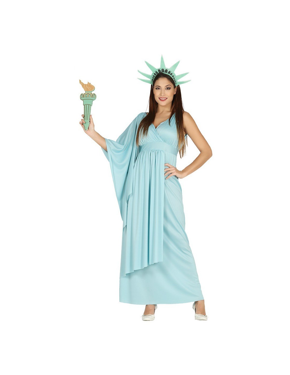 Il costume da Statua della Libertà ti trasforma nella celebre icona americana con un elegante abito lungo azzurro/verde acqua in stile greco-romano. Il set comprende la caratteristica tunica drappeggiata che ricorda le antiche toghe, la corona a spicchi tipica del monumento newyorkese e la torcia della libertà come accessorio fondamentale. Il tessuto fluido e la vestibilità comoda permettono libertà di movimento per tutta la serata. Un travestimento che unisce storia e patriottismo americano in un look riconoscibile e d'effetto.