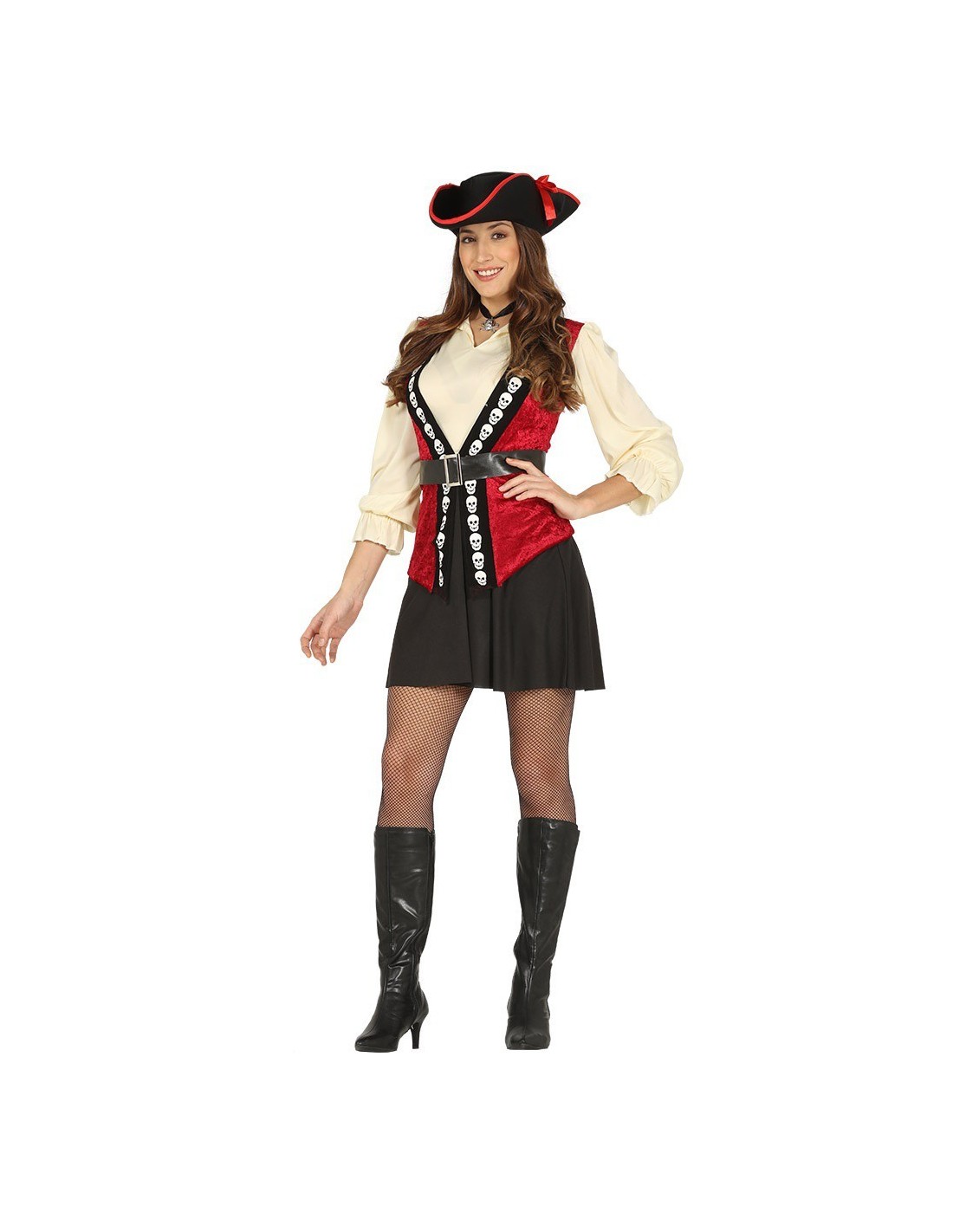 Trasformati in un'affascinante corsara dei mari con questo costume da pirata donna completo. Il set include una camicia color crema con maniche a tre quarti, un elegante corpetto rosso con dettagli neri e cintura decorativa, una gonna corta nera e il caratteristico cappello da pirata tricorno nero con bordi rossi. Il costume presenta una silhouette femminile che esalta le forme, perfetto per chi vuole interpretare una pirata seducente e avventurosa. Calze a rete e stivali non sono inclusi nel set.