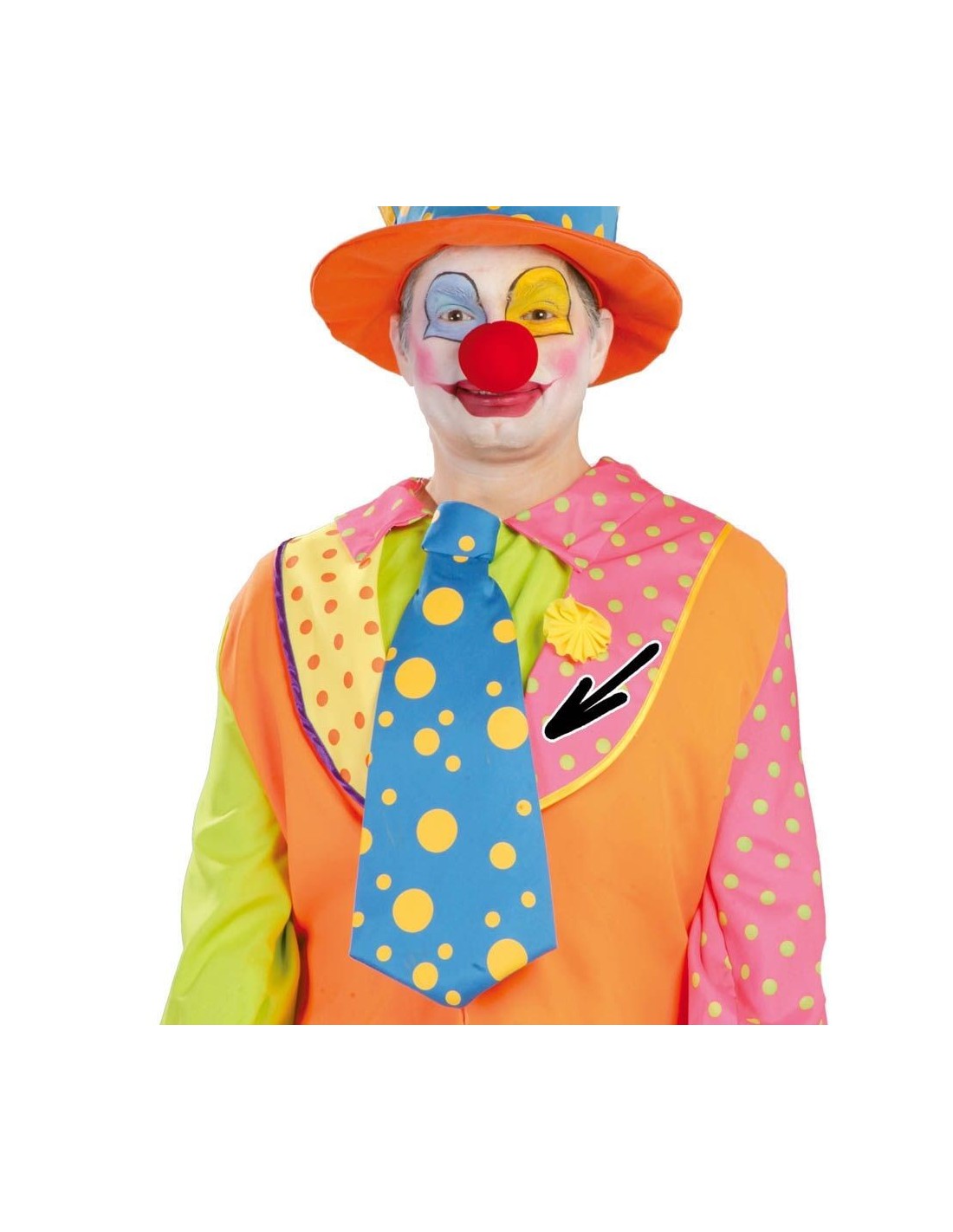 La cravatta clown rosa con pois gialli è l'accessorio fondamentale per completare il tuo travestimento da clown. Realizzata in tessuto morbido con vivaci pois gialli su sfondo rosa brillante, questa cravatta dona subito un tocco allegro e colorato al costume. Il prodotto include esclusivamente la cravatta, perfetta per essere abbinata a costumi da clown multicolore e outfit circensi. La forma oversize tipica degli accessori da clown garantisce massima visibilità scenica.