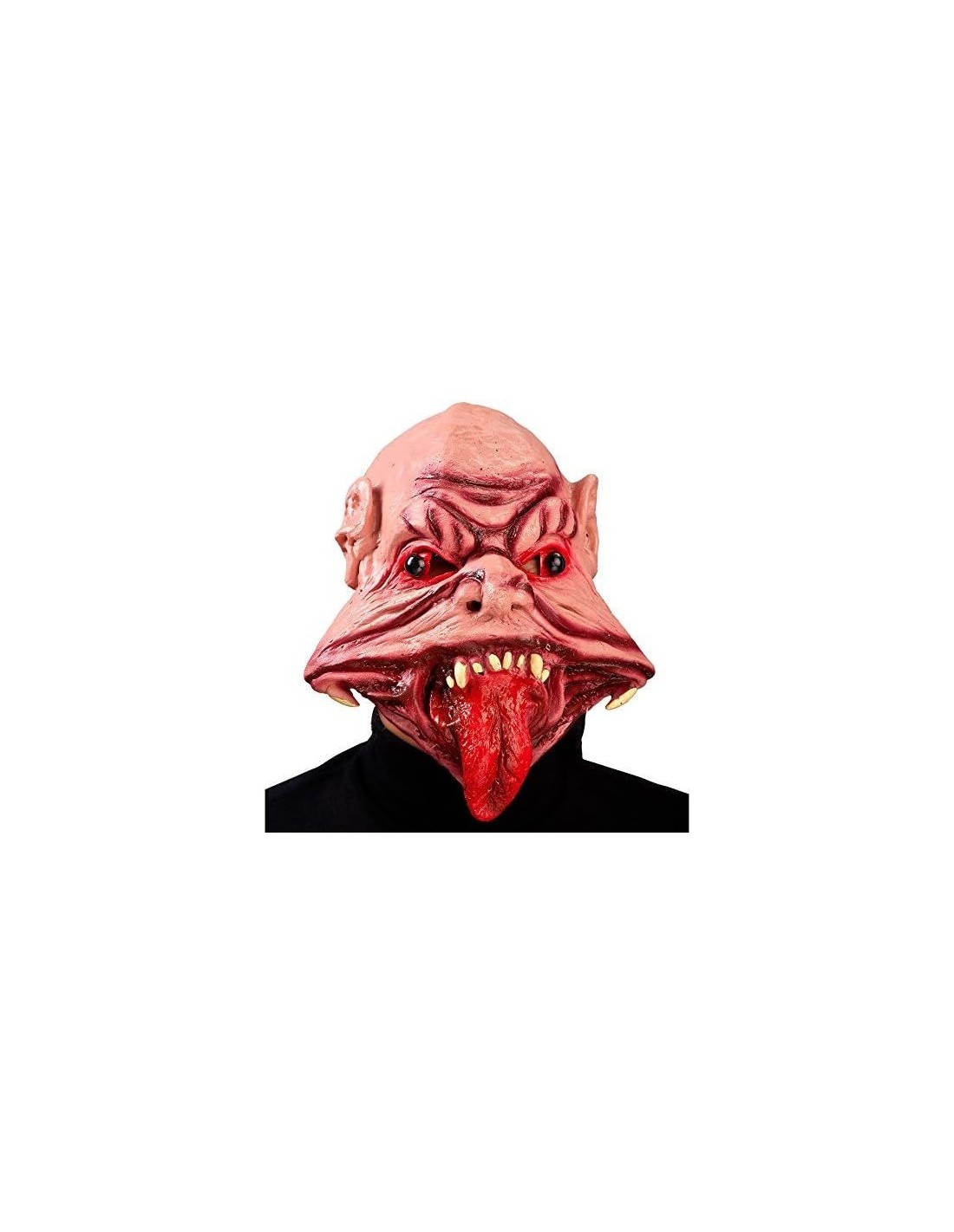 Questa inquietante maschera da mostro in latex rappresenta una creatura demoniaca con dettagli raccapriccianti. Il design presenta una pelle rugosa di colore rosso carne, occhi rossi penetranti e una lunga lingua rossa che fuoriesce minacciosamente dalla bocca. I denti aguzzi e ingialliti completano l'aspetto mostruoso di questa maschera che copre completamente la testa. Realizzata in latex flessibile, garantisce comfort durante l'uso e una vestibilità che si adatta alla maggior parte delle teste.