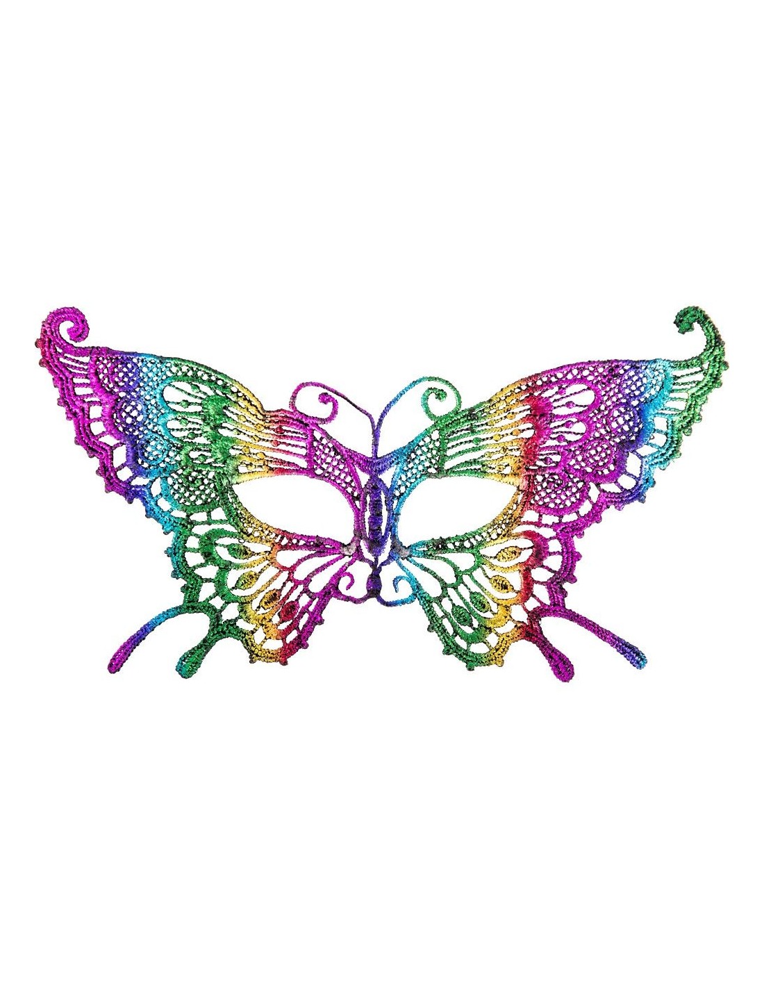 La maschera farfalla multicolor in tessuto macramé rappresenta l'eleganza delle tradizionali maschere veneziane con un tocco di modernità cromatica. Realizzata con la tecnica del macramé, presenta un design elaborato che ricorda le ali di una farfalla con sfumature che spaziano dal viola al verde, dal blu al rosa, creando un effetto rainbow affascinante. La lavorazione traforata del tessuto dona leggerezza e movimento, mentre i dettagli decorativi valorizzano il viso di chi la indossa. La maschera è dotata di lacci per il fissaggio dietro la testa.