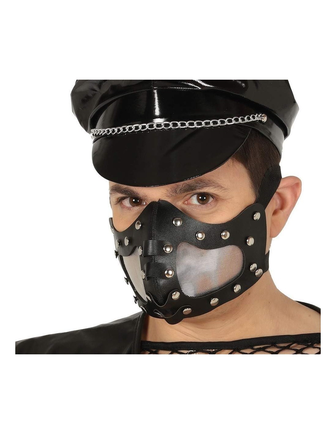 Maschera sadomaso nera realizzata in similpelle con dettagli metallici e borchie argentate. L'accessorio presenta una fascia trasparente all'altezza della bocca e cinturini regolabili per una vestibilità confortevole. Il design audace e provocante è caratterizzato da elementi decorativi che creano un look distintivo e trasgressivo. La maschera copre parzialmente il viso lasciando liberi gli occhi e garantendo una buona visibilità.