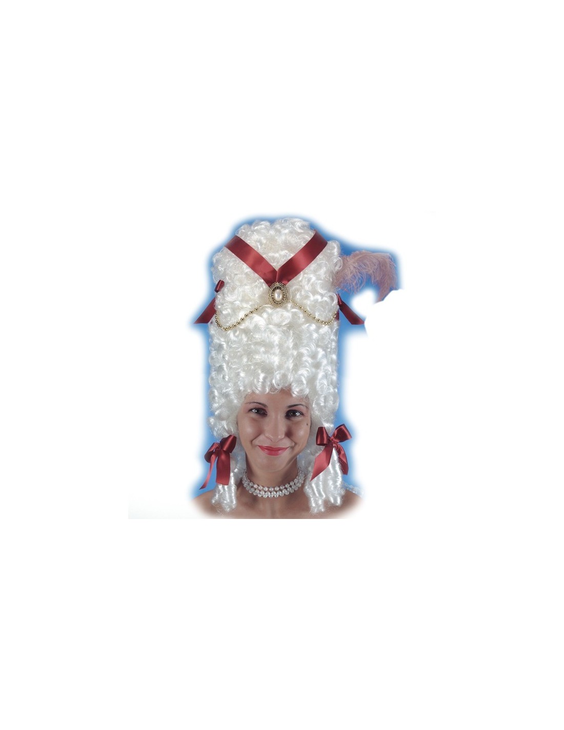 Magnifica parrucca Pompadour bianca ricca di decorazioni raffinate, perfetta per ricreare lo stile aristocratico del XVIII secolo. Questa elegante parrucca presenta l'iconica acconciatura alta tipica dell'epoca, arricchita da nastri rossi e dettagli decorativi che richiamano la moda della corte francese. Realizzata con fibre sintetiche di qualità, offre un aspetto voluminoso e scenografico che cattura immediatamente l'attenzione. Il design accurato riproduce fedelmente le elaborate pettinature dell'aristocrazia settecentesca, rendendola un accessorio indispensabile per ogni travestimento storico di classe.