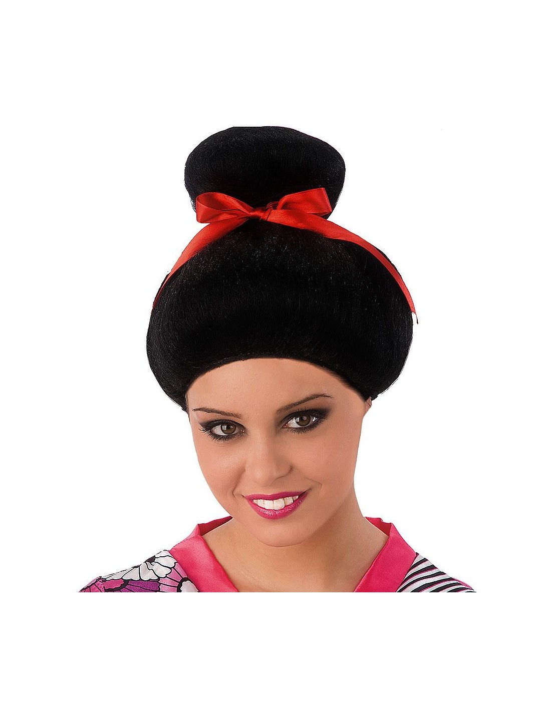 Trasformati in un'elegante gheisha orientale con questa raffinata parrucca nera caratterizzata da un tradizionale chignon raccolto sulla sommità del capo, impreziosito da un delicato fiocco rosso. La parrucca ricrea fedelmente l'acconciatura tipica delle geishe giapponesi, con capelli corvini perfettamente lisci e lucenti. Il design autentico permette di completare qualsiasi costume a tema orientale o giapponese. Realizzata in fibra sintetica resistente, si adatta comodamente alla testa garantendo una vestibilità sicura durante tutta la durata dell'evento.