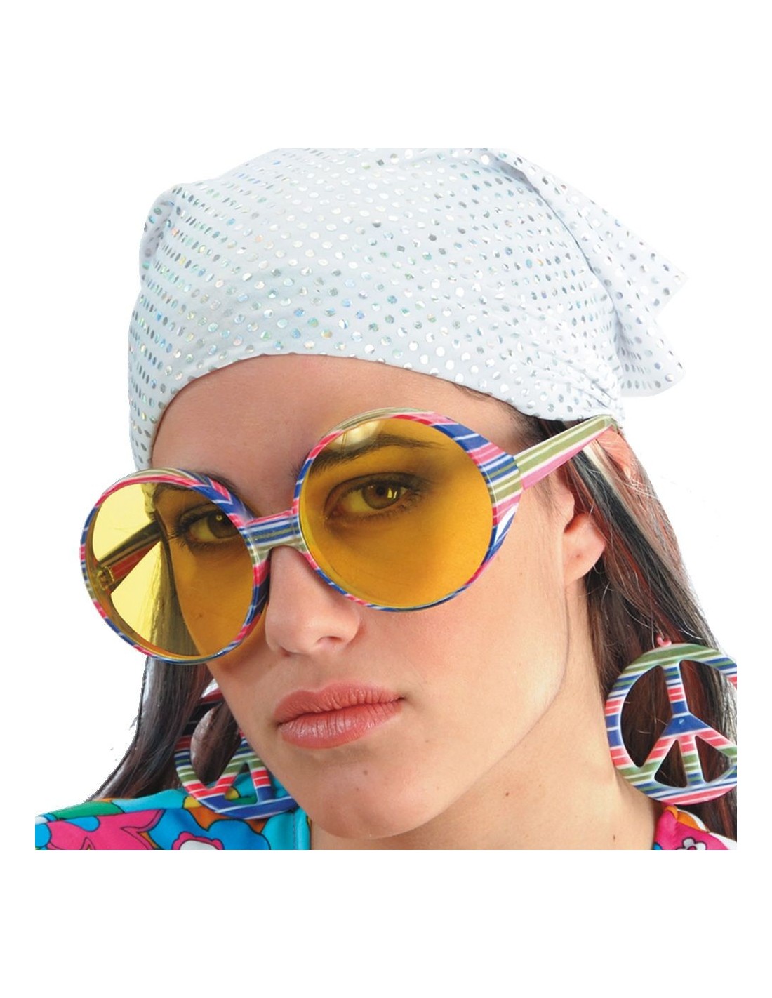 Completa il tuo look hippie con questi fantastici occhiali anni '70 dal design psichedelico multicolore. Il set include gli occhiali con montatura decorata a righe arcobaleno e lenti gialle, perfetti per ricreare l'atmosfera peace and love degli anni Settanta. Le lenti colorate donano un tocco distintivo mentre la montatura presenta motivi geometrici vivaci che catturano l'essenza del movimento hippie. Accessorio indispensabile per trasformazioni a tema flower power.