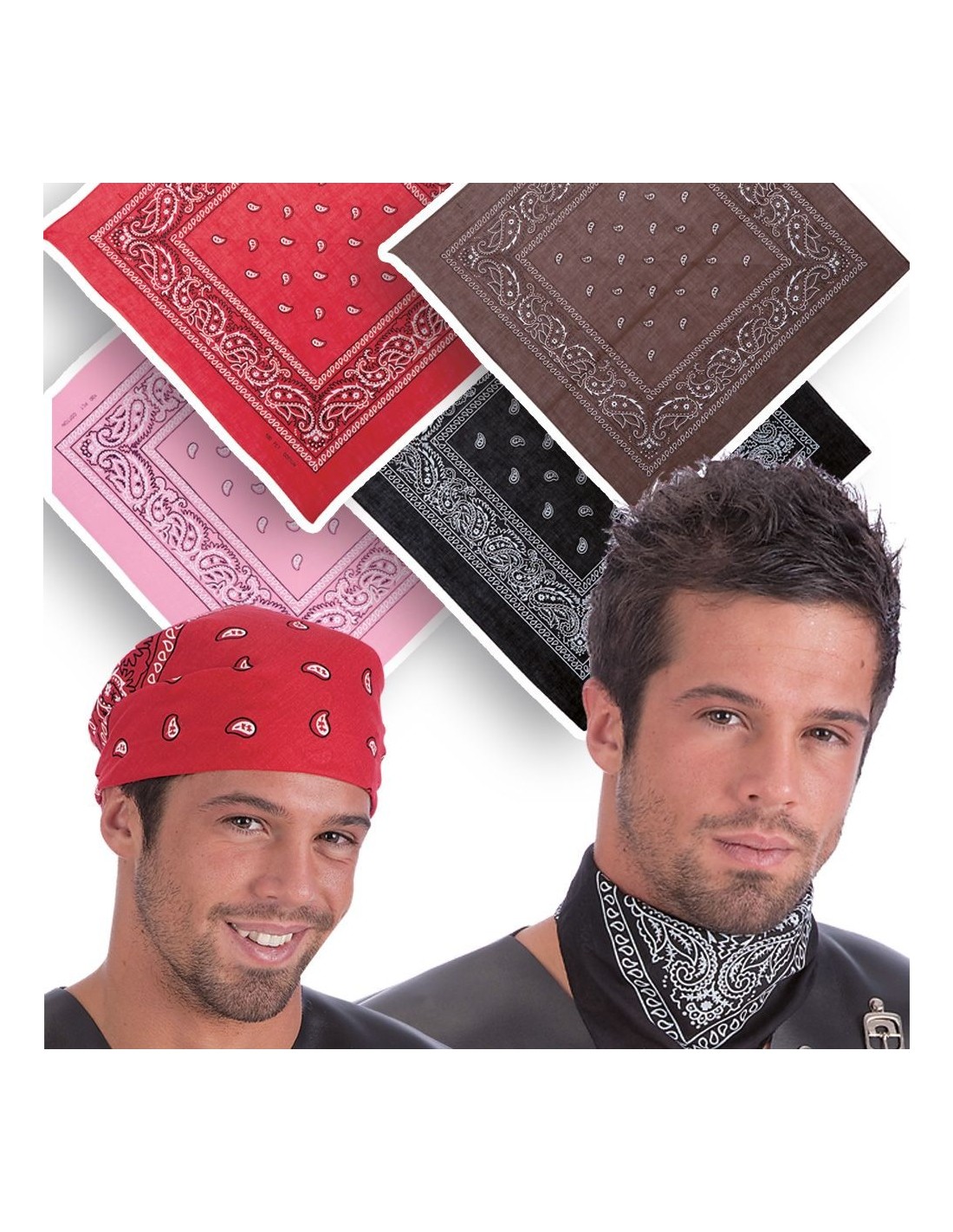 Bandana classica in tessuto disponibile in diversi colori assortiti, con dimensioni di circa 55x55 cm. Questo accessorio versatile presenta il tradizionale motivo paisley su tessuto morbido e confortevole da indossare. Perfetta per completare numerosi look e costumi, la bandana può essere utilizzata in molteplici modi: intorno al collo, sulla testa, come fascia o come accessorio decorativo. L'ampia varietà di colori disponibili permette di abbinarla facilmente a qualsiasi outfit o costume a tema.