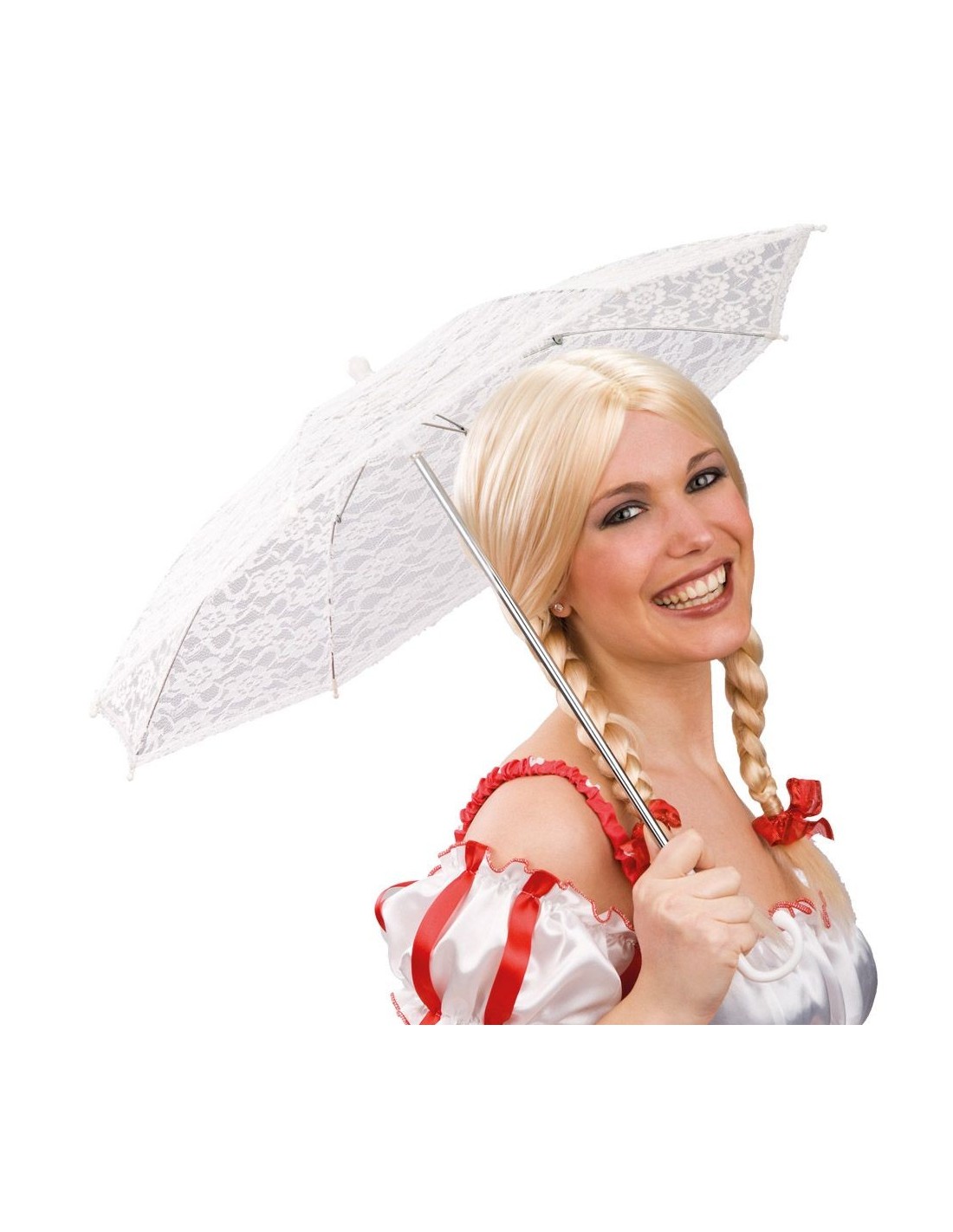 Elegante ombrellino di pizzo bianco con diametro di circa 60 centimetri, perfetto per completare costumi d'epoca e travestimenti storici. Questo accessorio vittoriano presenta un raffinato pizzo traforato che aggiunge un tocco di classe e autenticità al tuo look. L'ombrellino è dotato di manico resistente e struttura leggera per un utilizzo confortevole durante eventi e feste. Ideale per dame vittoriane, costumi ottocenteschi e personaggi storici femminili.