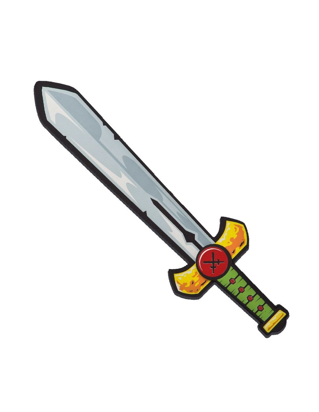 Questa spada da cavaliere medievale è realizzata in materiale EVA serigrafato e misura circa 52 cm di lunghezza, perfetta per completare qualsiasi costume da cavaliere o guerriero medievale. Il design presenta una lama argentata con impugnatura decorata in oro e verde, caratterizzata da dettagli che richiamano l'epoca medievale. L'accessorio è specificamente pensato per bambini e garantisce sicurezza durante il gioco grazie al materiale morbido ma resistente dell'EVA.