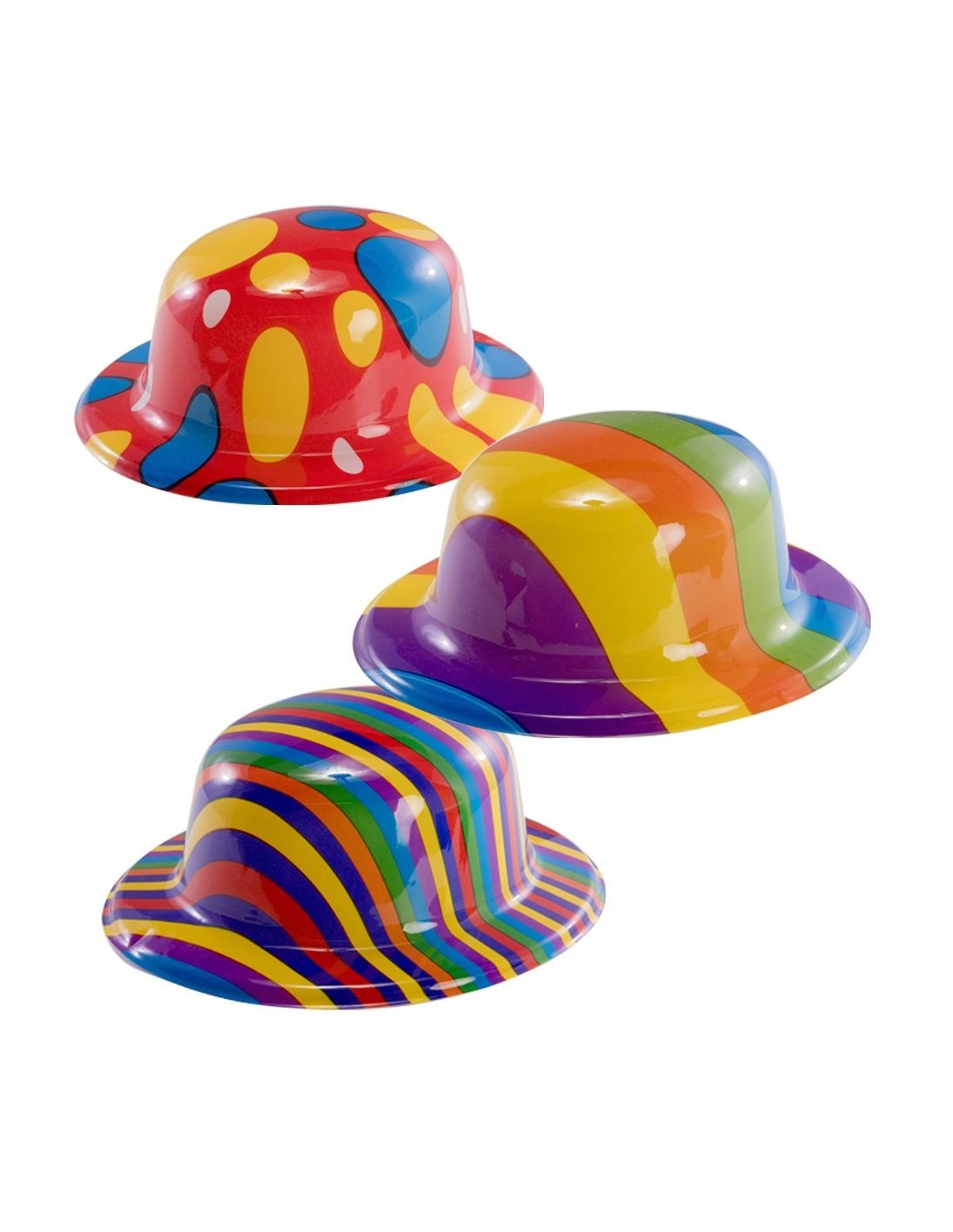 La bombetta in plastica serigrafata è l'accessorio perfetto per completare qualsiasi travestimento con stile e originalità. Realizzata in plastica resistente e decorata con vivaci serigrafie multicolore, questa bombetta assortita aggiunge un tocco divertente e colorato al tuo costume. L'articolo include una singola bombetta con fantasia casuale tra quelle disponibili, caratterizzata da colori brillanti e pattern allegri che la rendono adatta a molteplici occasioni festive.