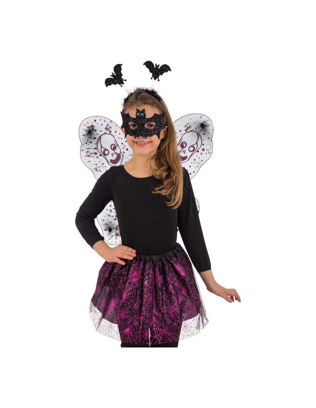 Questo magico set streghetta fucsia trasformerà la tua bambina nella perfetta piccola strega! Il set comprende ali traslucide di circa 45x44 cm decorate con ragnatele e ragni, una gonna in tulle fucsia con stampe gotiche, un cerchietto con pipistrellini e una maschera nera coordinata. L'outfit combina elementi spettrali con tonalità vivaci per un look incantevole e misterioso. Le ali ampie permettono movimenti scenografici, mentre la gonna in tulle crea un effetto vaporoso perfetto per danzare tra sortilegi e magie.