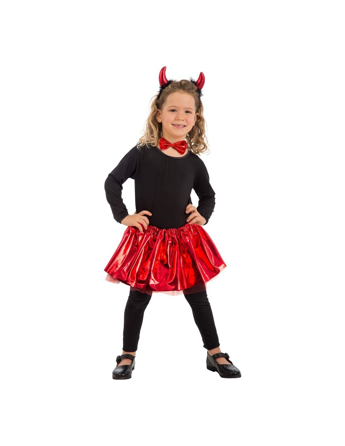 Trasforma la tua bambina nella diavoletta più adorabile con questo set completo che include cerchietto con cornetti rossi, gonna rossa metallizzata, coda da diavolo e papillon rosso coordinato. Il completo è perfetto per creare un look da piccola diablesse giocosa e divertente. Il cerchietto è dotato di cornetti rossi brillanti, mentre la gonna presenta una texture metallizzata che cattura la luce. La coda e il papillon completano il travestimento per un effetto scenografico garantito.