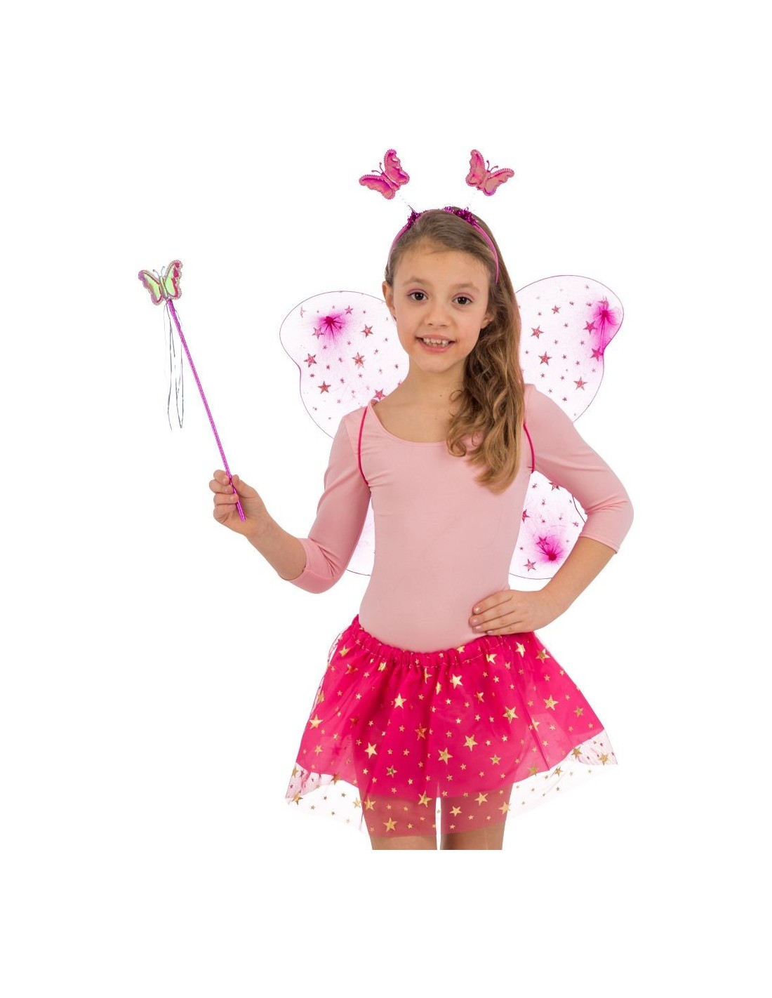Trasformati in una graziosa farfalla con questo incantevole set fucsia completo di tutti gli accessori necessari. Il costume include ali trasparenti con decorazioni rosa di circa 40x50 cm, gonna tulle stellata fucsia, cerchietto con farfalline decorative e bacchetta magica coordinata. Le ali presentano dettagli brillanti e sono perfette per svolazzare in ogni occasione, mentre la gonna in tulle crea un look fiabesco e femminile.