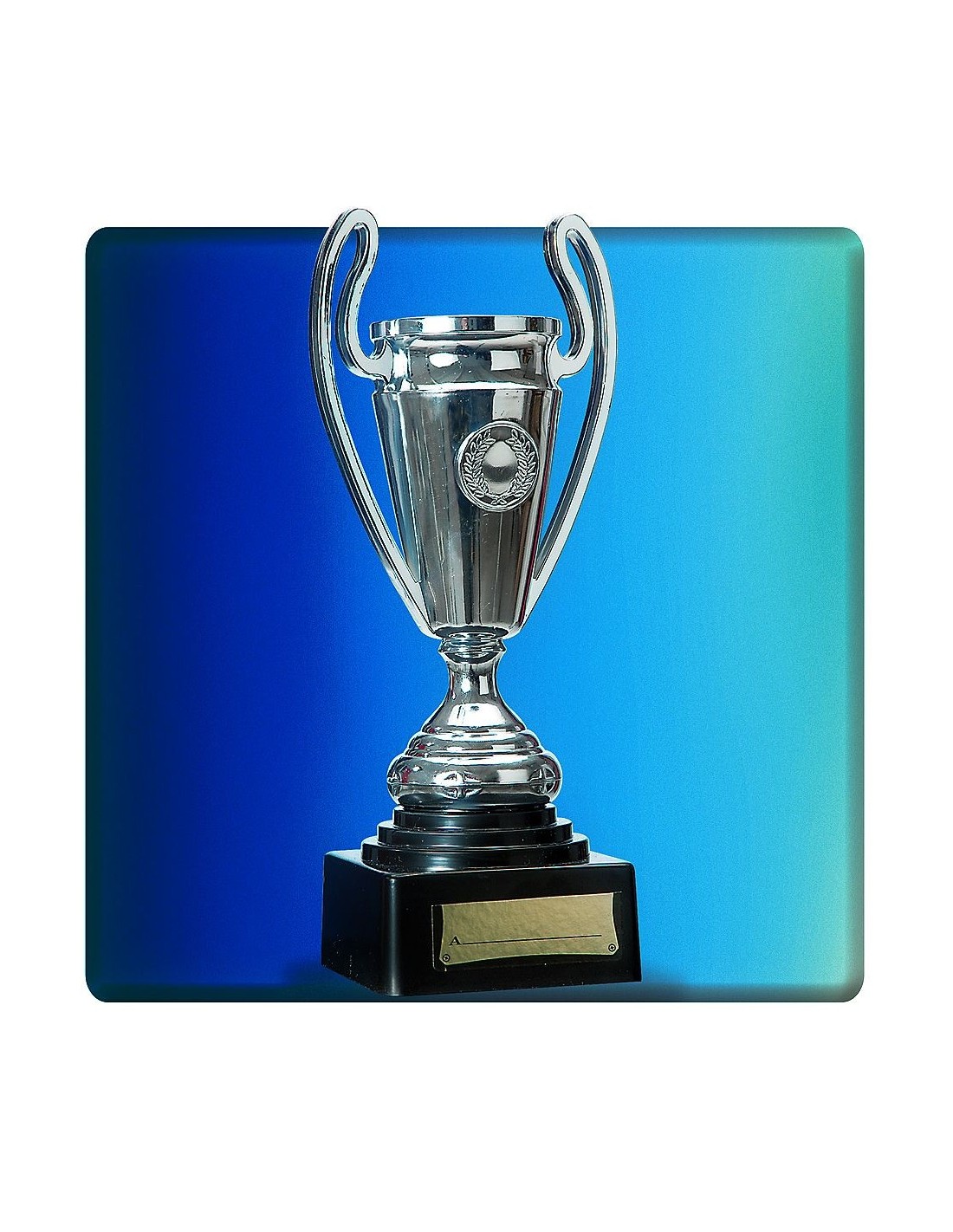 Elegante coppa trofeo in metallo argentato dall'altezza di circa 24 centimetri, completa di base nera e targhetta personalizzabile. Presenta il classico design a calice con manici laterali e finitura lucida che riflette la luce. La struttura robusta poggia su una solida base che garantisce stabilità, mentre la targhetta dorata consente di aggiungere incisioni personalizzate per commemorare vittorie e successi.