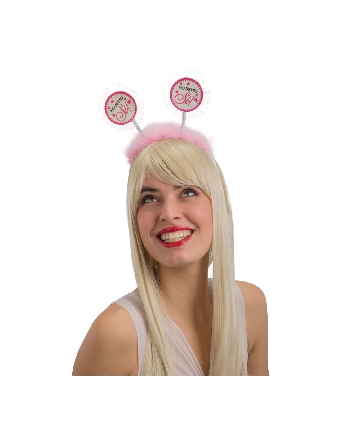 Il cerchietto HO DETTO SI con marabout è l'accessorio perfetto per celebrare il grande passo verso il matrimonio. Questo delizioso cerchietto rosa presenta due medagliette rotonde con la scritta celebrativa e soffici piume di marabout che aggiungono un tocco di eleganza e femminilità. Le antennine flessibili permettono una vestibilità confortevole per tutta la durata della festa. Un accessorio indispensabile per rendere ancora più speciale questo momento unico.