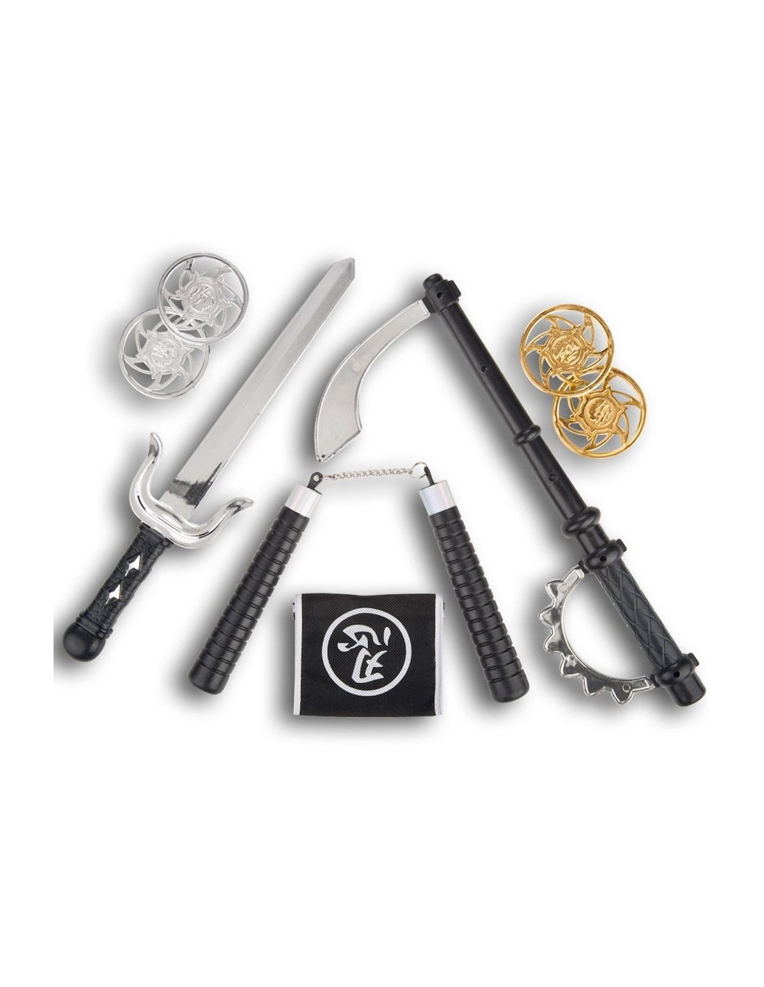 Trasformati nel più temibile guerriero ninja con questo incredibile set completo di 8 armi tradizionali. Il kit include katana, sai, nunchaku, shuriken, pugnale, catena e altri accessori essenziali per completare il tuo arsenale da ninja. Ogni arma è realizzata in materiali resistenti con dettagli realistici che ricreano fedelmente le armi tradizionali dell'antica arte marziale giapponese. Perfetto per completare qualsiasi costume da ninja o samurai.