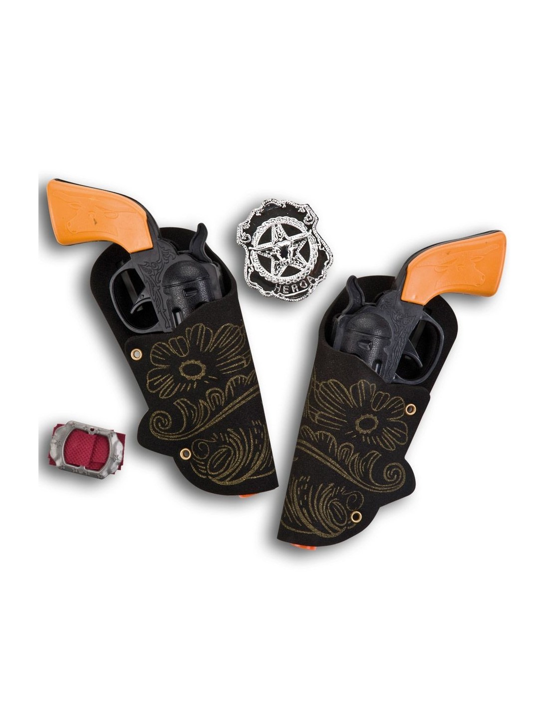 Questo completo da cowboy per bambino trasforma ogni piccolo in un autentico sceriffo del Far West. Il set include un cinturone western lungo circa 80 cm, due pistole giocattolo con impugnature arancioni e fondine decorative, oltre a una stella da sceriffo in metallo argentato. Le fondine presentano eleganti decorazioni dorate su base nera, mentre le pistole hanno dettagli realistici. Perfetto per completare qualsiasi costume western e permettere ai bambini di vivere avventure nel selvaggio west.