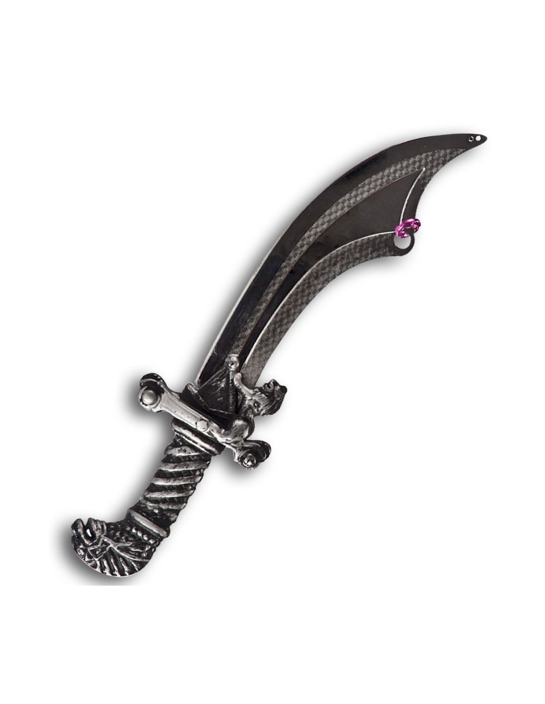 Sciabola pirata dalla lama curva nera con dettagli decorativi e impugnatura metallica elaborata, lunga circa 28 centimetri. L'accessorio presenta una lama scura con texture particolare e un'impugnatura avvolta con elementi decorativi che richiamano lo stile dei pirati dei Caraibi. Il design ricorda le classiche scimitarre utilizzate dai corsari durante l'età d'oro della pirateria. Perfetta per completare qualsiasi travestimento da pirata o corsaro.