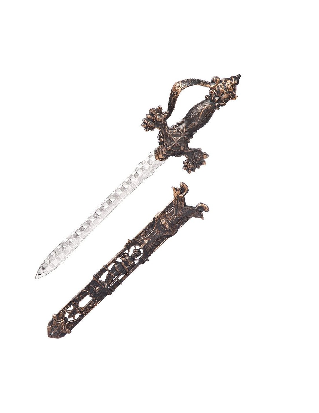 Spada decorativa con fodero riccamente ornato, perfetta per completare costumi medievali, da cavaliere, pirata o fantasy. L'arma finta presenta una lama argentata e un fodero marrone decorato con dettagli in rilievo che riproducono motivi classici. La lunghezza di circa 40 cm la rende maneggevole e sicura per feste e rappresentazioni. L'impugnatura ergonomica e il design accurato rendono questo accessorio un elemento distintivo per qualsiasi travestimento d'epoca.
