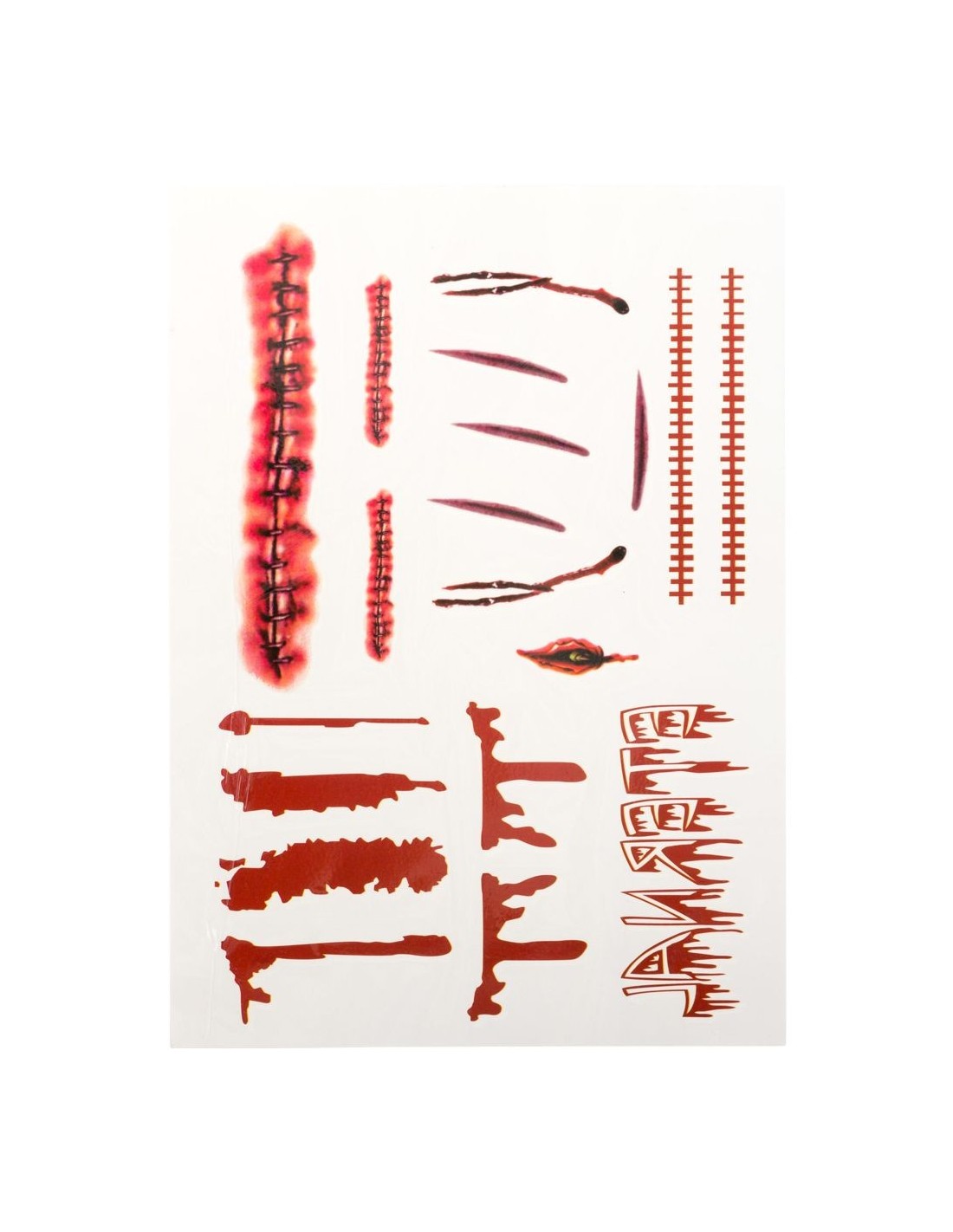Questo set di tatuaggi temporanei include una vasta collezione di cicatrici insanguinate e ferite realistiche per creare effetti horror davvero impressionanti. La cartella contiene diversi tipi di cicatrici: tagli profondi, suture chirurgiche, graffi sanguinanti e lesioni di varie dimensioni. I tatuaggi sono facili da applicare con acqua e resistenti per tutta la durata della festa. Perfetti per trasformare qualsiasi costume in un look horror da brivido.