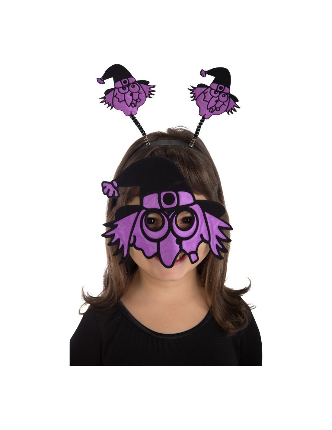 Questo fantastico set da strega include una coloratissima maschera viola con dettagli neri e un divertente cerchietto con due piccole streghe danzanti. Realizzato in tessuto rifrangente che cattura la luce, questo accessorio trasforma istantaneamente il tuo look per Halloween. La maschera presenta un simpatico design con occhi grandi e dettagli che richiamano il mondo magico delle streghe, mentre il cerchietto con le mini-streghe ondeggianti aggiunge un tocco giocoso e originale al costume.