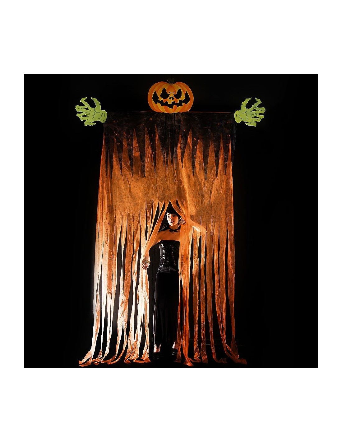 Questa imponente tenda decorativa a forma di zucca gigante raggiunge un'altezza di circa 350 cm, perfetta per creare un'atmosfera horror mozzafiato. La decorazione include una testa di zucca intagliata minacciosa e due mani verdi in EVA foam che completano l'effetto spaventoso. La tenda in tessuto arancione crea un fondale scenografico ideale per trasformare qualsiasi ambiente in un set da brivido. Il design permette a una persona di nascondersi dietro le strisce della tenda per creare effetti speciali ancora più terrificanti.