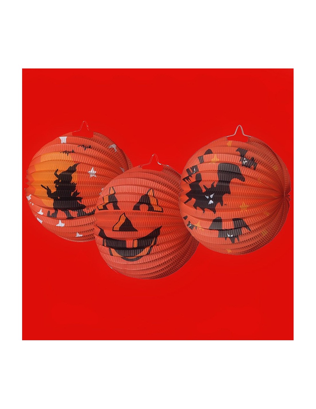 Globo decorativo in carta dal diametro di circa 22 cm, perfetto per creare l'atmosfera giusta durante le celebrazioni di Halloween. Questa lanterna arancione presenta decorazioni tipiche della festa più spaventosa dell'anno, con silhouette nere di pipistrelli, streghe, zucche e altri simboli horror. La struttura pieghevole in carta colorata permette un facile montaggio e una conservazione pratica. Ideale per essere appesa o posizionata come centrotavola, dona un tocco festoso e misterioso a qualsiasi ambiente.