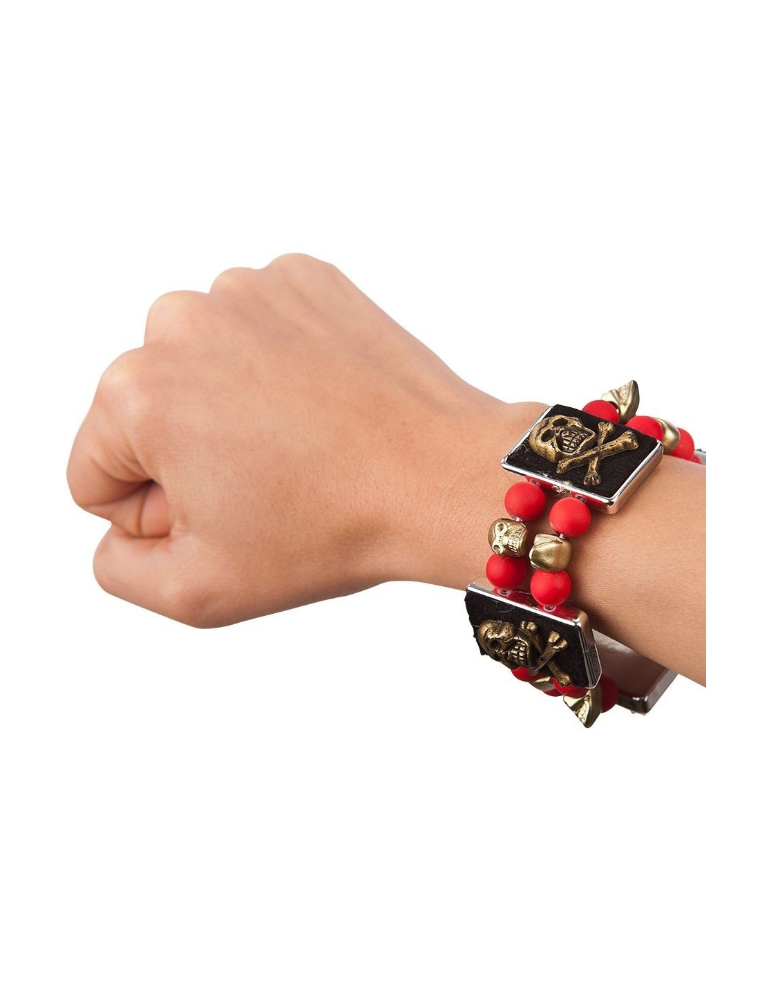 Bracciale Halloween con teschi in metallo e perle rosse indossato al polso per costumi horror