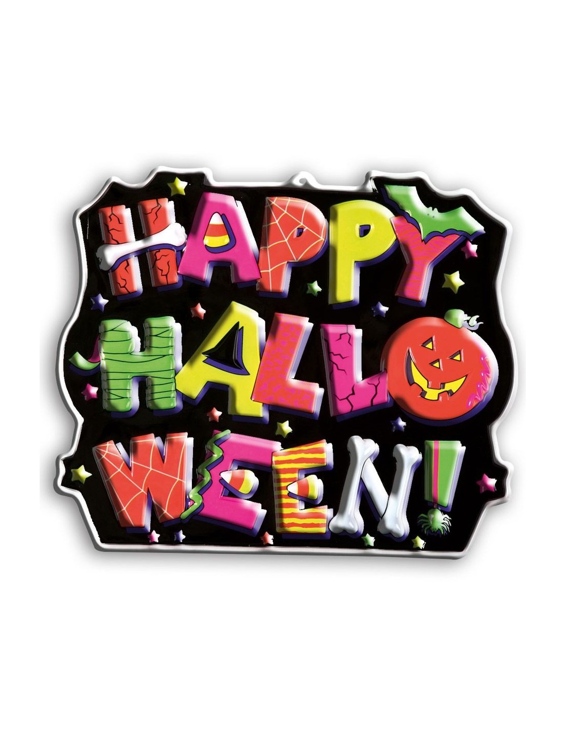 Il Poster Happy Halloween in rilievo è una decorazione spettacolare che trasforma qualsiasi ambiente in un'atmosfera da brivido. Con dimensioni di circa 45x55 cm, presenta lettere colorate in rilievo che creano un effetto tridimensionale davvero d'impatto. Il design include zucche sorridenti, ragni, pipistrelli e altri elementi tipici di Halloween su sfondo nero, perfetto per creare l'ambientazione giusta per la notte più spaventosa dell'anno. La stampa multicolore con effetto rilievo rende questo poster un elemento decorativo che non passa inosservato.