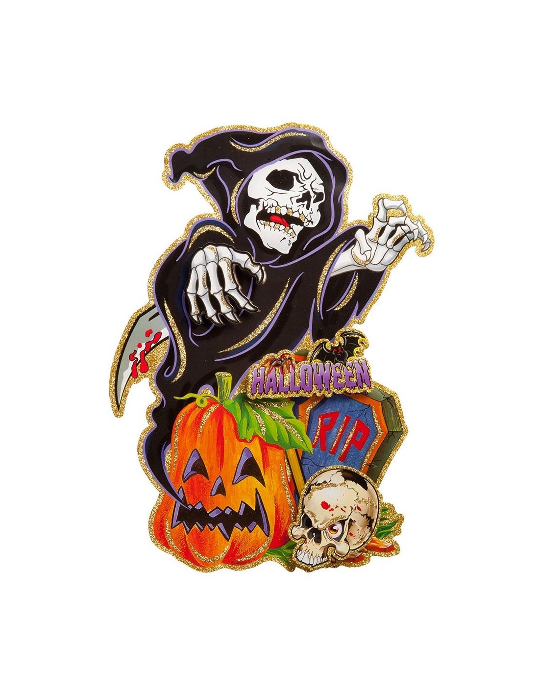 Questo suggestivo poster decorativo Halloween raffigura una scena macabra con la morte incappucciata, teschi e una zucca intagliata dai toni arancioni vivaci. Realizzato in carta con effetto rilievo e dettagli glitterati che catturano la luce, misura circa 40x30 cm ed è perfetto per decorare pareti, finestre o qualsiasi ambiente durante il periodo di Halloween. I colori intensi e i dettagli tridimensionali creano un impatto visivo notevole, mentre gli elementi glitter aggiungono un tocco scintillante alla decorazione.