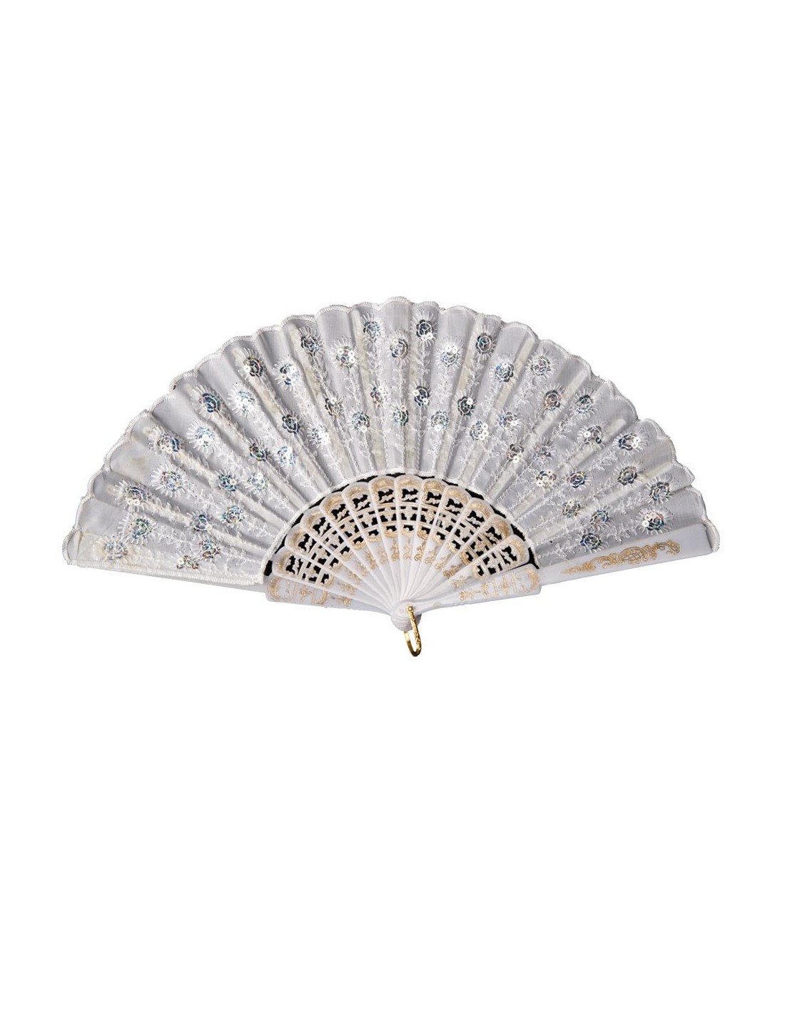 Questo raffinato ventaglio in tessuto bianco decorato rappresenta l'accessorio perfetto per completare costumi d'epoca, travestimenti eleganti e look teatrali. Realizzato con tessuto delicato impreziosito da decorazioni, si apre a ventaglio creando un effetto scenografico di grande impatto. L'accessorio presenta una struttura pieghevole che consente di aprirlo e chiuderlo con facilità, mentre le decorazioni sul tessuto bianco aggiungono un tocco di raffinatezza al look.