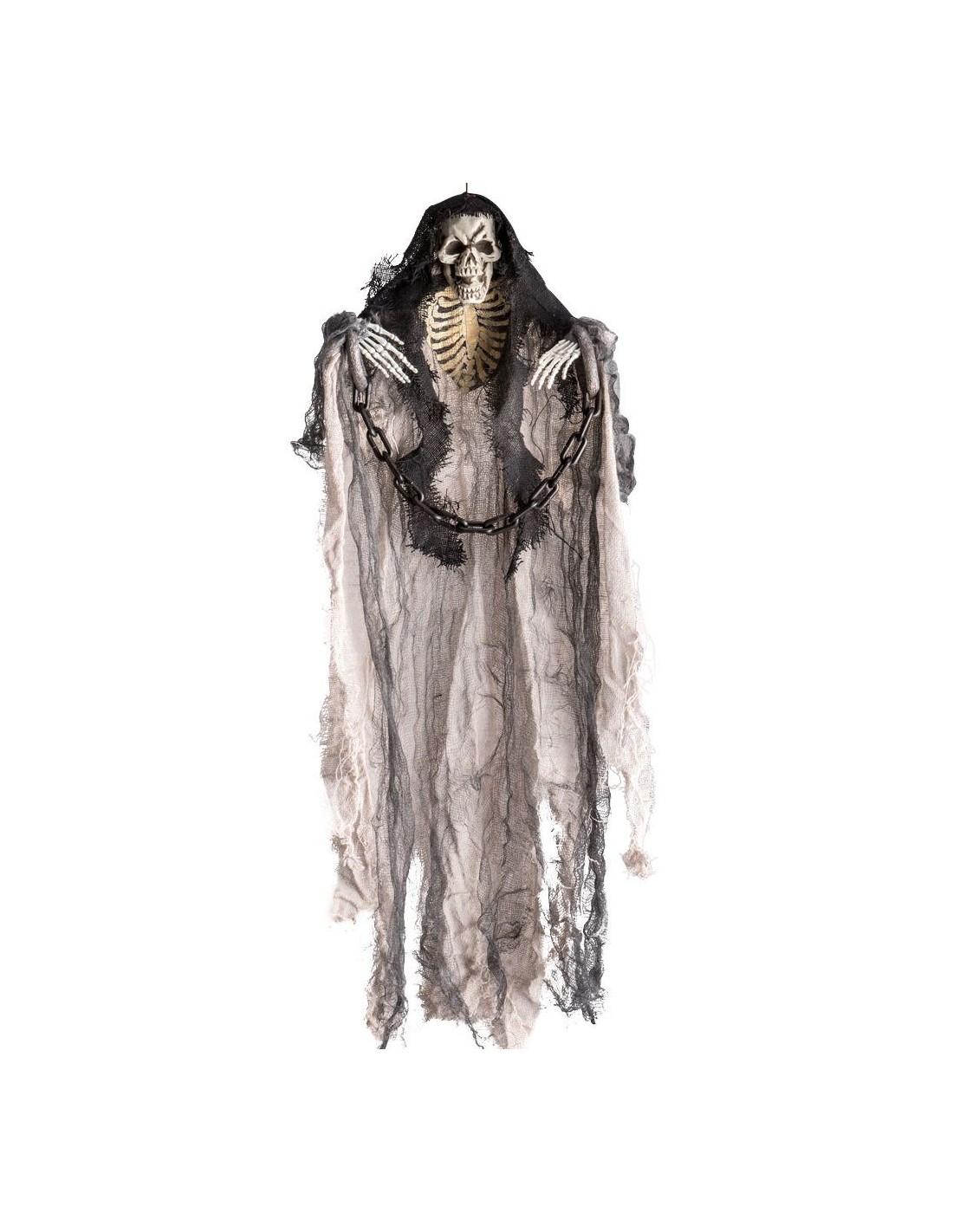 Inquietante scheletro decorativo da appendere perfetto per creare un'atmosfera da brivido. Questo elemento decorativo di circa 60 cm di altezza presenta una stampa realistica su tessuto tattered con dettagli anatomici convincenti, completato da lunghe catene metalliche che amplificano l'effetto spaventoso. Il mantello in tessuto logoro e strappato crea un movimento naturale che rende la decorazione ancora più suggestiva. Facile da appendere ovunque grazie al sistema di sospensione integrato.