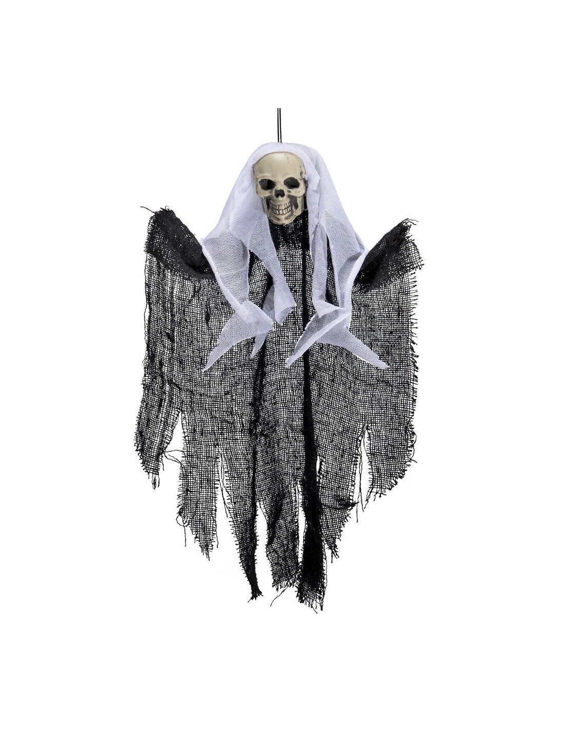 Questo scheletro decorativo nero da appendere è l'elemento perfetto per creare un'atmosfera inquietante e suggestiva. Alto circa 30 centimetri, presenta un mantello nero logoro con cappuccio bianco che avvolge una figura scheletrica dalla testa teschio. Le ali nere sfilacciate e il corpo in tessuto consumato creano un effetto spettrale molto realistico. La decorazione è dotata di gancio per essere facilmente appesa a porte, finestre, pareti o ovunque si desideri creare un angolo horror.