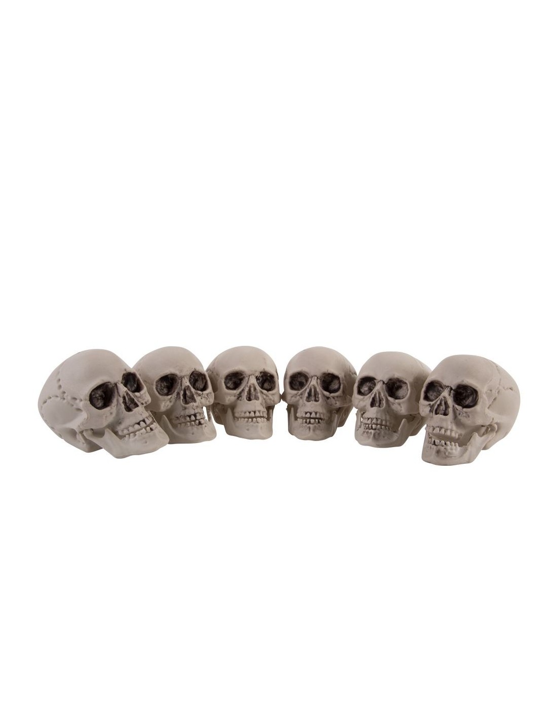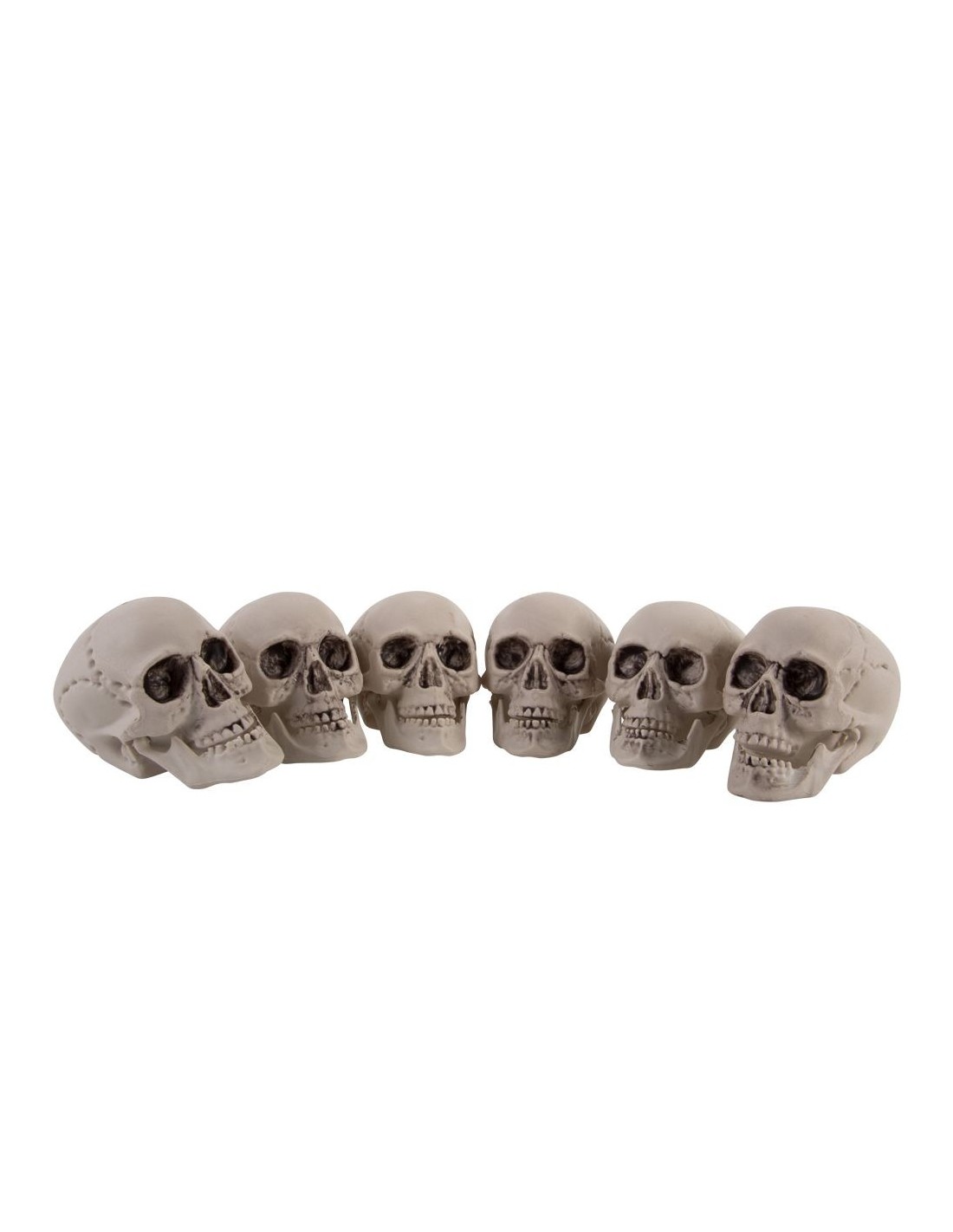 Questo set comprende 6 teschi decorativi in plastica di circa 7 cm di altezza ciascuno, perfetti per creare un'atmosfera spaventosa e macabra. I teschi presentano dettagli anatomici realistici con orbite cave, denti prominenti e texture che ricorda l'osso invecchiato. Realizzati in materiale plastico resistente, sono ideali per decorazioni temporanee o permanenti. Il set include esclusivamente i 6 teschi mostrati in foto.