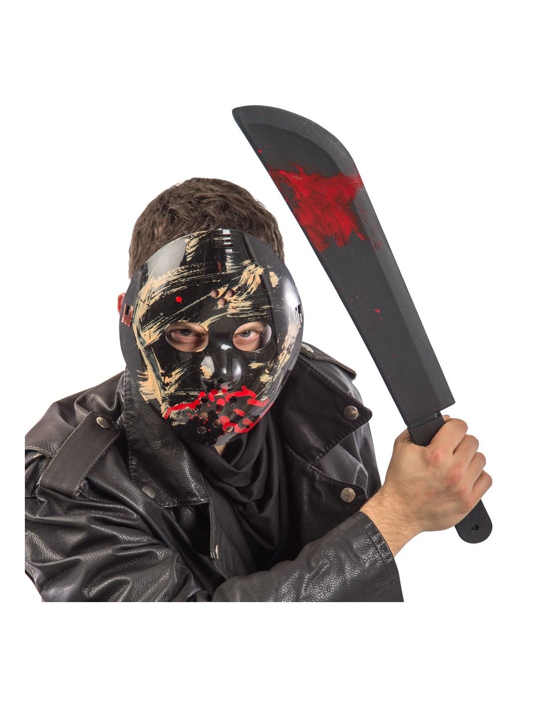 Questo inquietante set horror hockey comprende una maschera da hockey sanguinolenta con dettagli rossi e un machete lungo circa 54 cm. La maschera presenta un design disturbante con macchie di sangue finto e graffi, mentre il coltellaccio ha una lama scura con effetti di sangue per un look terrificante. Perfetto per chi vuole trasformarsi nel più spaventoso killer mascherato e terrorizzare amici e nemici.