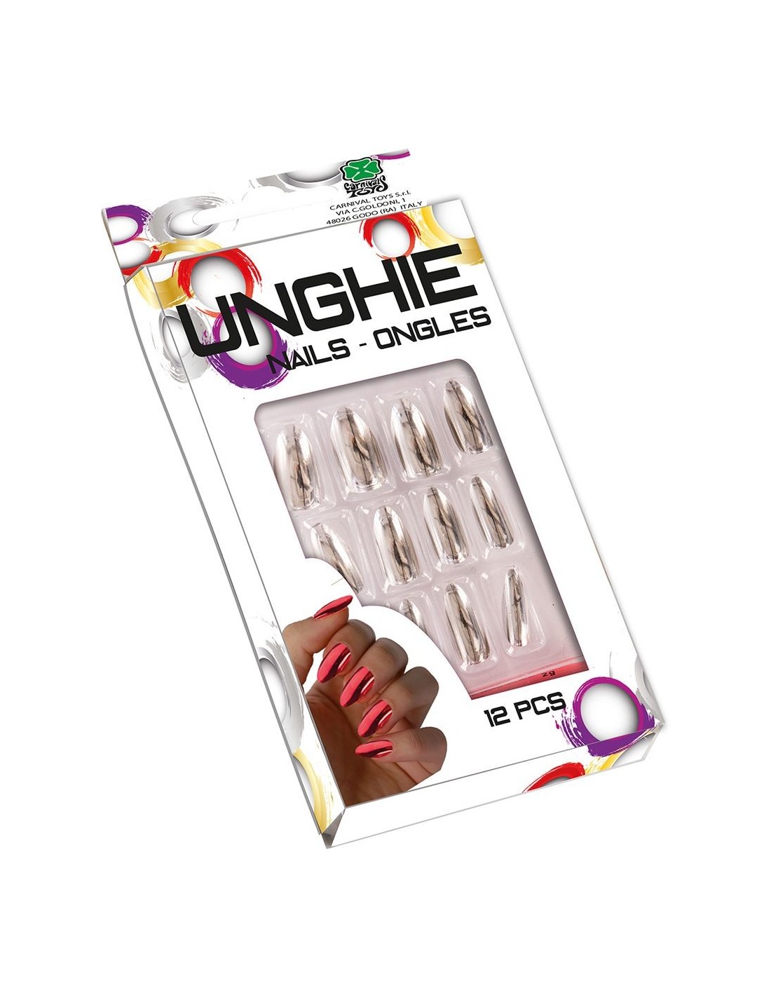 Trasforma le tue mani con questo set di unghie finte dal finish argento metallizzato che cattura la luce ad ogni movimento. Il set comprende 12 unghie artificiali dalla finitura cromata e lucente, perfette per creare un look futuristico e glamour. Le unghie presentano una superficie riflettente che dona alle mani un aspetto robotico e scintillante, ideale per completare costumi spaziali, cyborg o semplicemente per aggiungere un tocco metallico al tuo outfit. Facili da applicare, si adattano alla forma naturale dell'unghia.