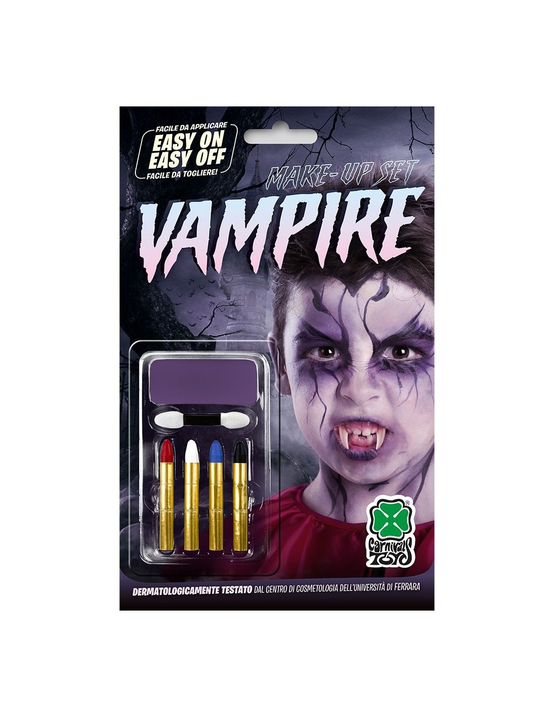 Completo kit per il trucco da vampiro che include fondotinta viola e 4 matite colorate per realizzare un perfetto make-up horror. Il set contiene tutto il necessario per trasformarsi in una creatura della notte: fondotinta dalla tonalità viola intensa e matite nei colori essenziali per definire occhi, labbra e dettagli spaventosi. Facile da applicare e rimuovere, questo kit ti permetterà di creare effetti scenografici impressionanti per completare il tuo costume vampiresco.