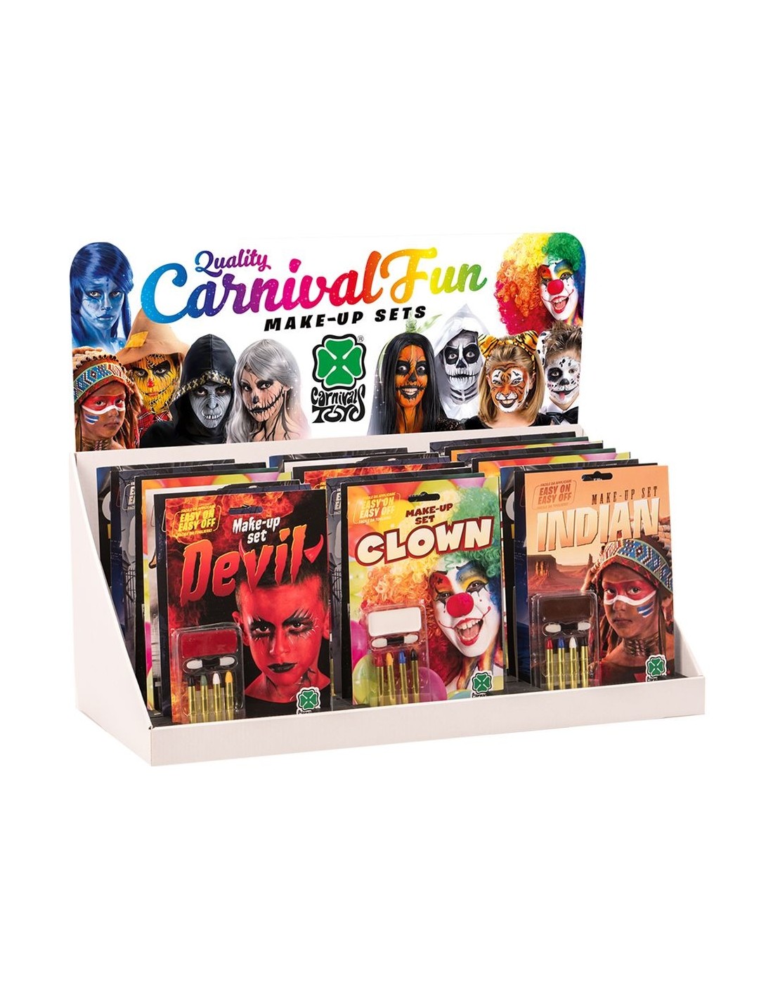 L'espositore completo per makeup professionale include 24 fondotinta in diverse tonalità e 4 matite colorate assortite, perfetto per truccare volti e creare look scenografici. Il set viene fornito nell'espositore originale che facilita l'organizzazione e la scelta dei prodotti. I fondotinta offrono una copertura uniforme mentre le matite colorate permettono di aggiungere dettagli e sfumature per completare ogni trasformazione.