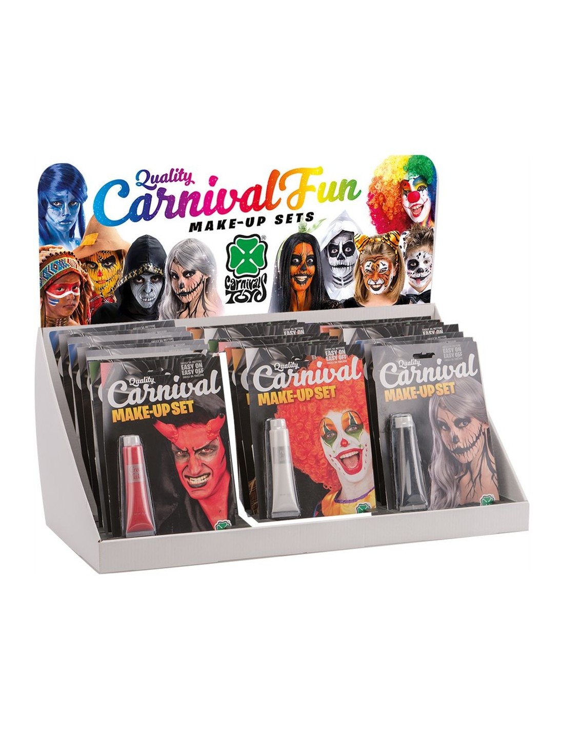 Espositore completo con 24 tubetti di fondotinta teatrale da 28,3 ml ciascuno, disponibili in colori assortiti perfetti per ogni tipo di caratterizzazione. Questo pratico espositore contiene una selezione variegata di tonalità che spaziano dai colori classici della pelle a quelli più fantasiosi per trucchi creativi e teatrali. I tubetti permettono un'applicazione precisa e uniforme del prodotto, garantendo una copertura omogenea per trasformazioni complete del viso.